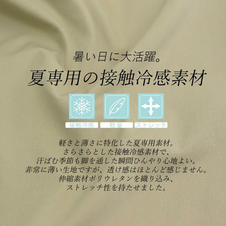 暑い日も迷わず穿ける、軽さと薄さに特化した夏専用パンツです。さらさらとした接触冷感素材で脚を通した瞬間ひんやり、快適な穿き心地。非常に薄い生地ですが目の詰まった生地で透け感をほとんど感じず一枚でしっかり穿けます。伸縮素材を織り込みストレッチ性もプラス。全方向に伸縮するので、しゃがんだりの動作や自転車に乗る時もノンストレス。シルエットは汎用性の高いベーシックなストレート。脚のラインを拾いづらい程よいゆとりで楽して美脚見せ。選べるSMLの3サイズ展開も嬉しい。両サイドには便利なポケット付き。ポケットの裏地はメッシュで清涼感を重視しました。暑い夏のパンツスタイルを後押しする注目のアイテムです。