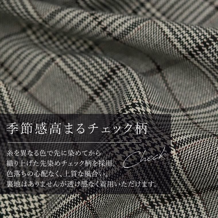 すっきりとした美脚効果が期待できるこだわりワイド、穿いた時のシルエットがとても綺麗なパンツです。糸を異なる色で先に染めてから織り上げた先染めのチェック生地を採用。きちんと感があり、上質な風合いです。色落ちの心配がないのも嬉しい。マニッシュになり過ぎないよう、生地にはレーヨンを織り込みしなやかな印象に仕立てました。ウエストはフロント脇までゴムでストレスレスな穿き心地。さっと穿けるプルオンデザインながらフェイクの前開き仕様&ベルトループ付きで、トップスをINした時もサマになるよう計算されています。コーディネートに取り入れるだけでシーズンムード高まるチェック柄パンツです。