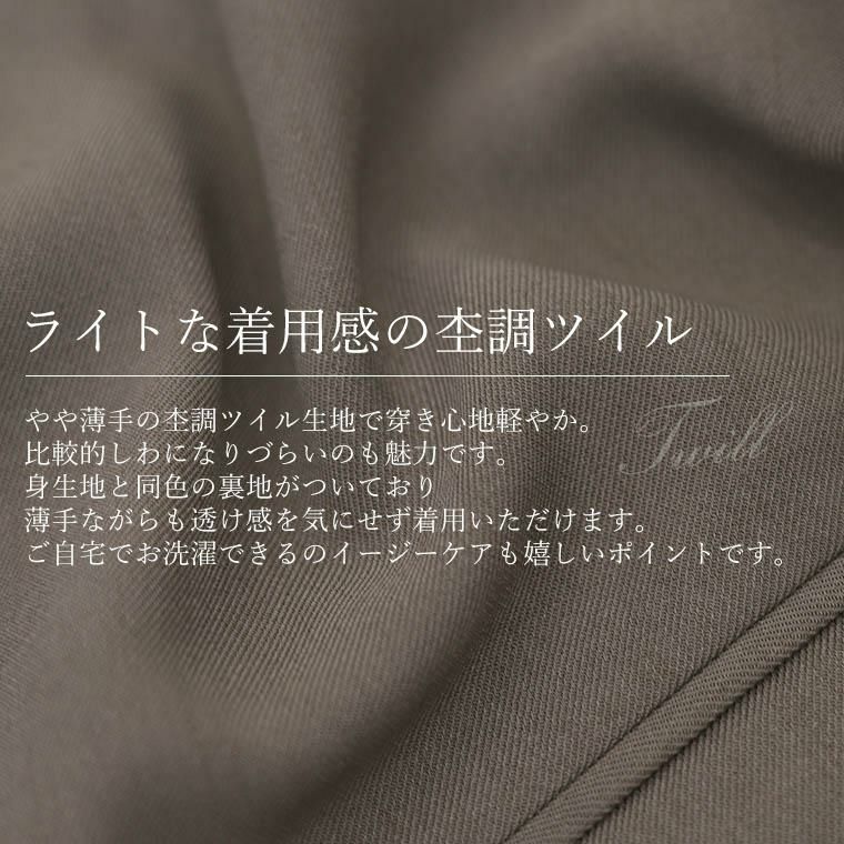 人気の杢調ツイル素材にすらり美脚ルックに仕上がるワイドパンツが登場。さらりとしたドライで軽い生地感。スラブ見えする表面変化が上品な印象を与えます。しわになりづらくお手入れ楽&きれいが長続き。フロントのタックが腰回りにゆとりを生み、ほどよい幅広さで気になるラインをカモフラージュ。ゆったりとした穿き心地ながら、生地の落ち感と計算されたワイド感ですらっとした美脚ラインを作ります。裏地は裾近くまでついており穿き心地安心。ベーシックなデザインで、オフィスにも休日にも活躍する頼れる一着です。