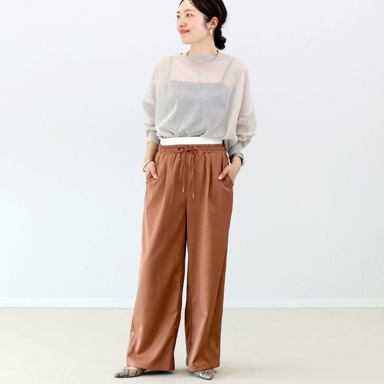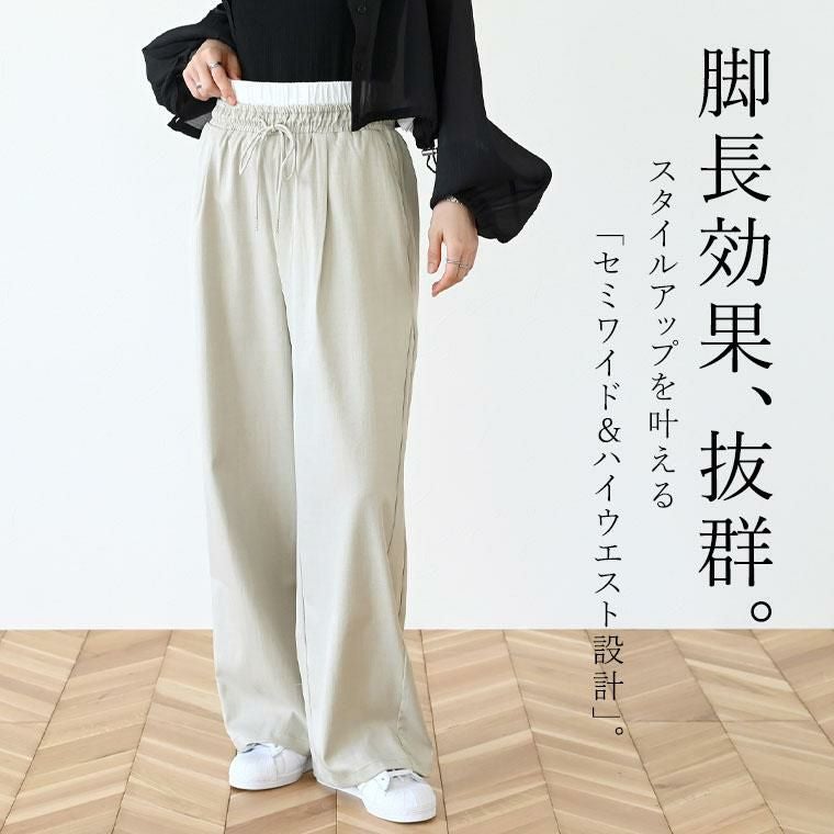 オンオフで着まわししやすいセミワイドシルエットの杢無地パンツ。裏地がなくても透け感がなく、シワにも強い綺麗見え生地仕立てです。ダブルウエストデザインの配色使いがトレンド感ただよい、いつものコーデをブラッシュアップ。トップスインして着れば、脚長効果にも期待できるハイウエスト設計です。全周ウエストゴム仕様なので穿き心地ラク、軽い着用感でオールシーズンで活躍します。