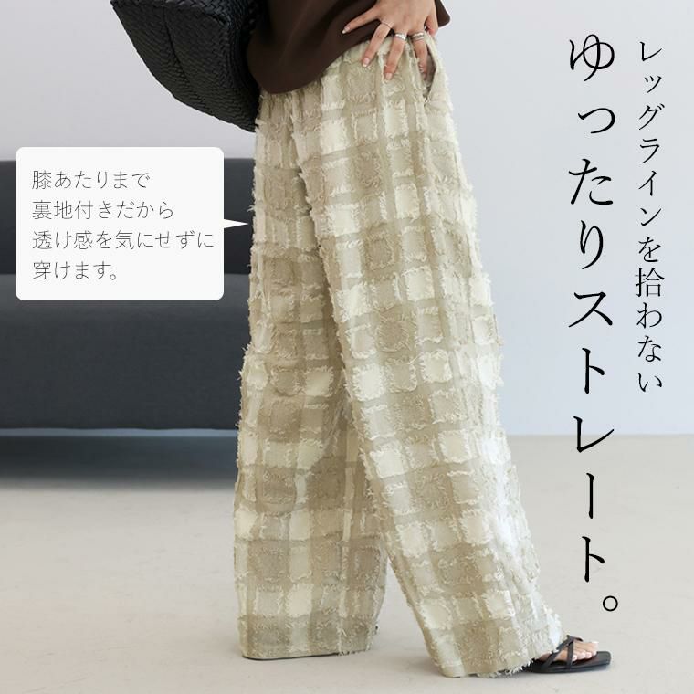 濃淡ある色合いと動きのある生地感のフリンジ付きチェック柄が特徴で、シンプルなトップスに合わせるだけで雰囲気のある着こなしに仕上がるワイドパンツ。表面変化のある生地なので部屋着感が払拭されます。ウエストは着脱がとても楽なプルオンデザイン。全周ゴム&ドロストでジャストサイズでの着用が可能です。下半身のラインをすっぽりカバーするワイドシルエットでゆとりある穿き心地、膝まで透け防止の裏地付きです。薄手素材で汗ばむ季節でも穿けるデザインパンツです。