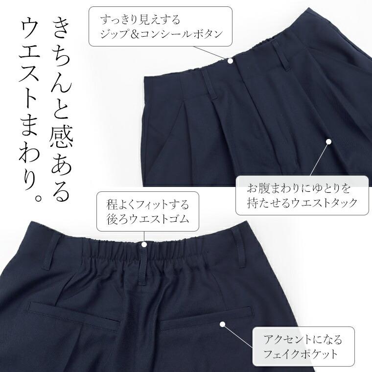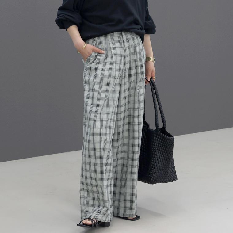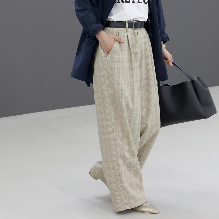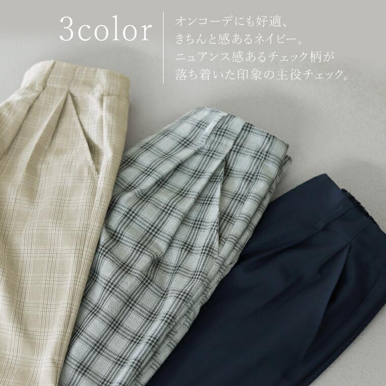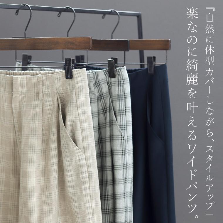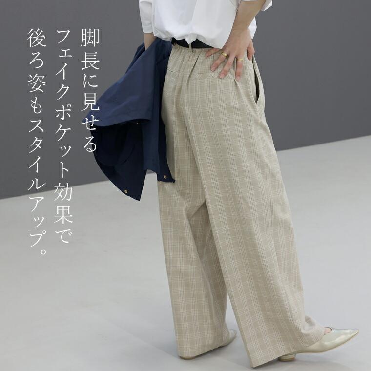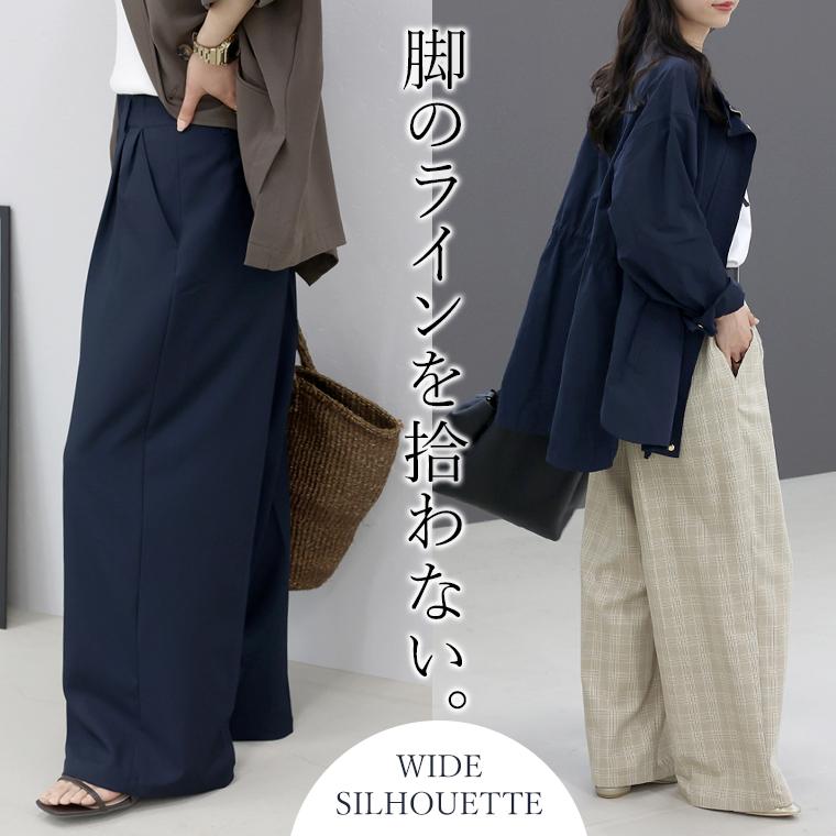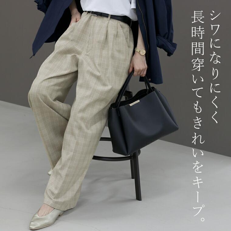 体型カバーをしつつ、すっきりとした縦ラインでスタイルアップをかなえるワイドパンツ。ウエストはツータック仕様となっており、お腹まわりをゆったりカバー。パンツ筒はレッグラインを拾わないワイドシルエットです。センタープレスが施されてさりげなく縦ラインを強調。程よくハリがありシワになりにくいツイル生地なので、長時間穿いても綺麗なシルエットをキープします。洗練されたネイビーと落ち着いたチェック柄のカラー展開。デイリーからお仕事スタイルまで頼れる、大人の為のワイドパンツです。