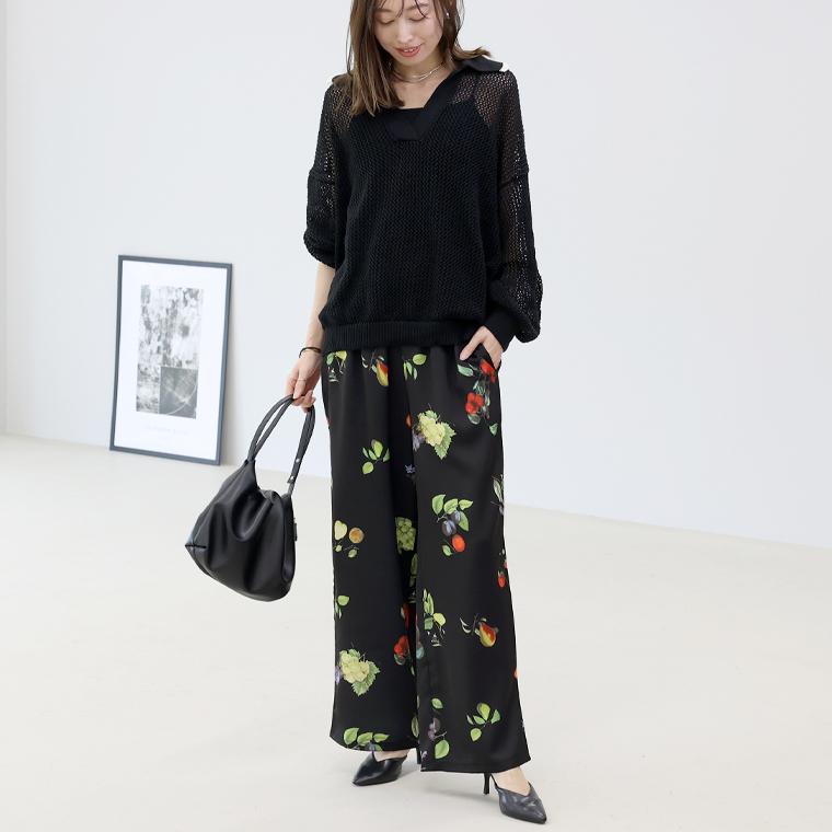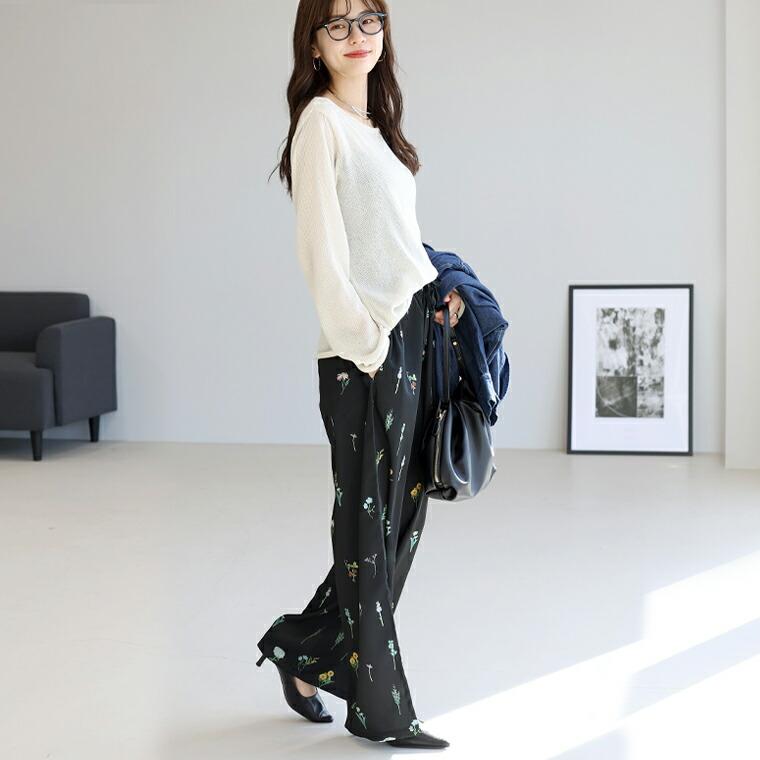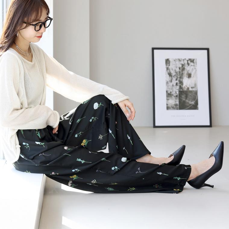 落ち感のあるサテン生地に大人っぽいボタニカル柄をプリントしたセミワイドパンツ。きれいなIラインを描くストレートシルエット。ゆったりリラックスな穿き心地ながら、落ち感があるからスッキリした見た目です。ウエストは総ゴム仕様でお腹周り楽ちん、裏地がなくても透けにくく安心です。コーデに加えるだけで洒落見えする主役パンツです。
