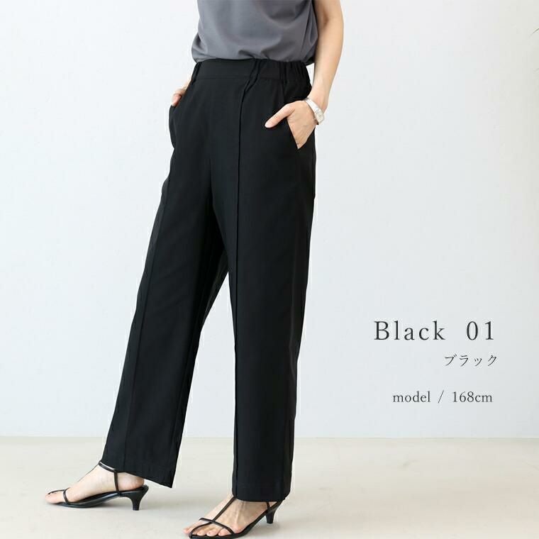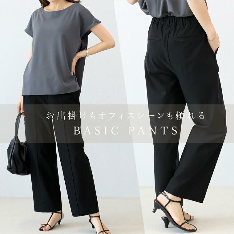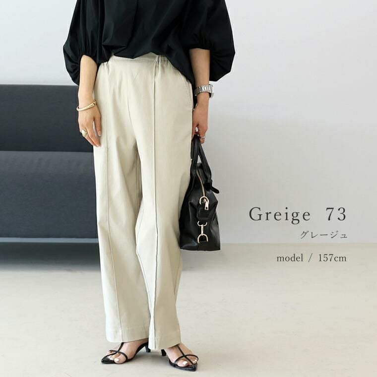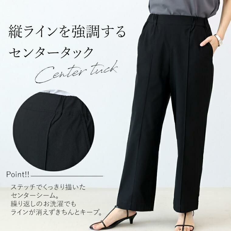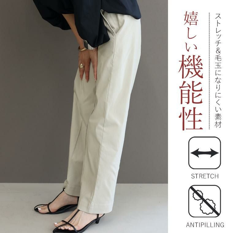 伸縮性抜群の生地で仕立てたストレートパンツ。横斜めにぐんと伸びる抜群のストレッチ力が自慢で、通年を通して穿ける生地を採用。デイリー使いから通勤、オフィスカジュアルまで幅広いシーンに活躍してくれる一着。毛玉になりづらい加工が施されているのも嬉しいポイントです。シルエットはゆったり穿けるワイドめのストレート。脚のラインを拾いづらいゆとりあるサイズ感で楽に穿け、さらに中央にあしらったセンターシームが縦のラインを強調しすらり美脚にみせてくれます。シンプルなデザインでコーデ不問、季節や流行りに左右されずたっぷり着まわせる万能ボトムです。