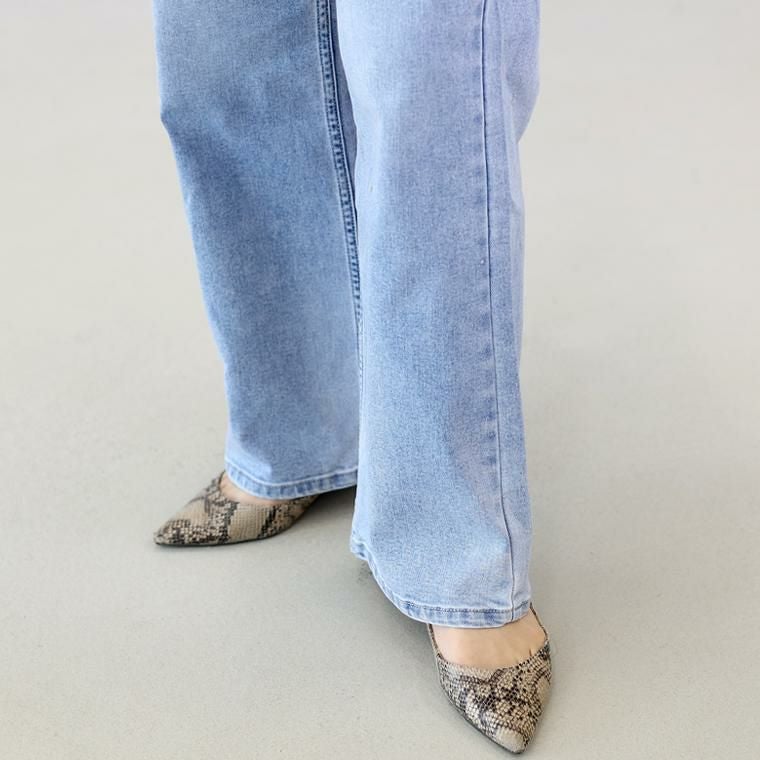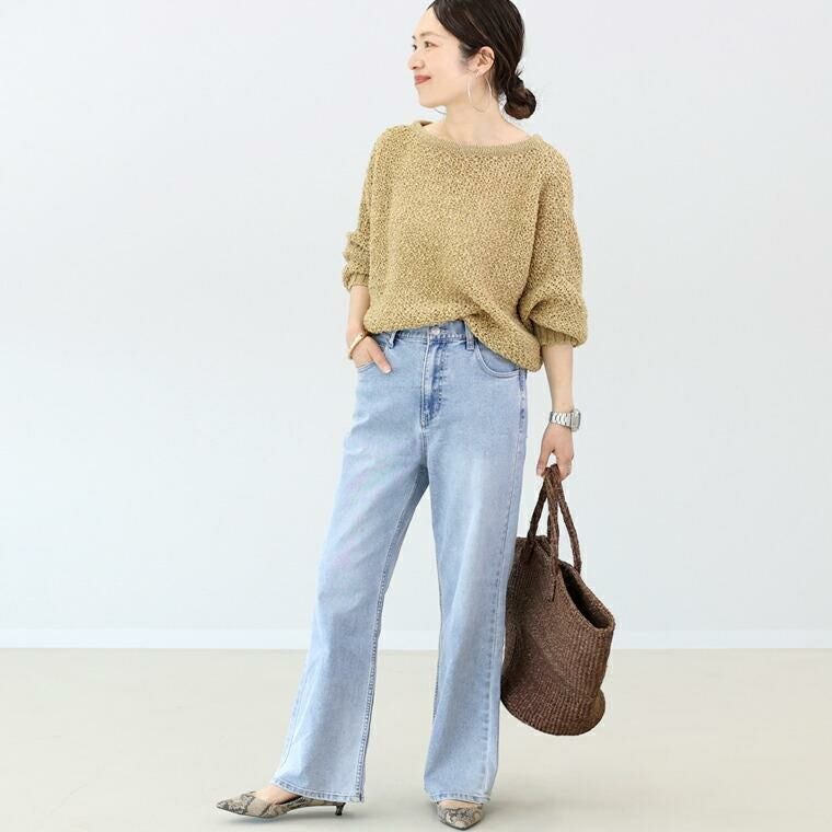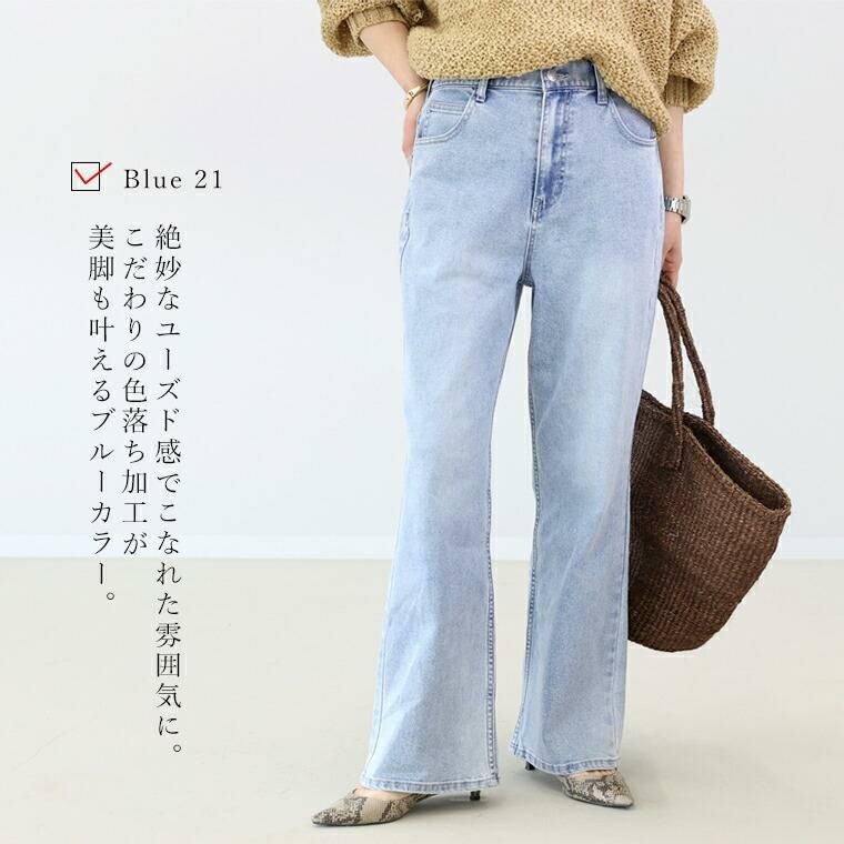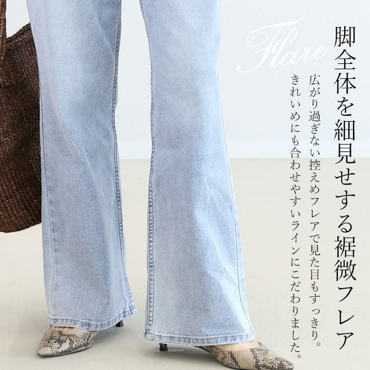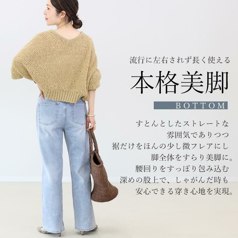 レッグラインを美しくみせるだけでなく、穿き心地の良さにもこだわった当店オリジナルのデニムボトム。ノンストレッチ風の本格派な見た目ながら、実は伸縮性にとても優れたストレッチデニムを採用。しなやかによく伸び、肌あたりの優しい生地を使いストレスフリーな穿き心地を実現しました。シルエットは、脚全体をすらっと細くみせるほんの少し裾を広げた微フレア。フレアといってもストレートよりのすっきりとしたラインできれいめスタイルにも合わせやすいシルエットになっています。深めの股上でしゃがんだ時も安心。デイリーに活躍する主力アイテムに。