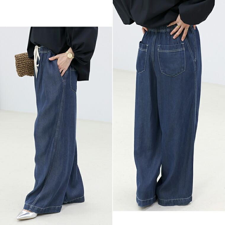 テンセルデニム素材の柔らかくなめらかな肌触りと軽い穿き心地が魅力のワイドデニム。9.5ozの程よい薄さでごわつかず、長いシーズン活躍します。ワイドシルエットで脚のラインを拾わず、すっきり見え。ウエスト全周ゴムでストレスフリー。ラクな穿き心地です。フロントファスナー仕様できちんと感もキープ。ドロストデザインがさりげないトレンド感をプラス。ライトグレーのステッチが軽やかで抜け感のあるアクセントに。サイド&ヒップポケット付き。ヒップアップ効果も。カジュアルすぎず、毎日穿きたくなる大人のための快適デニム。