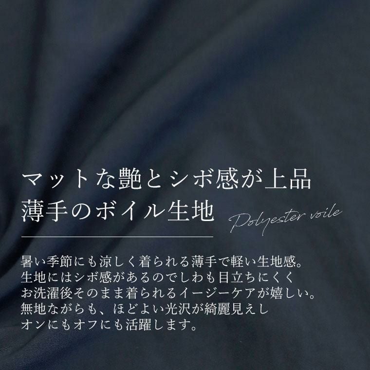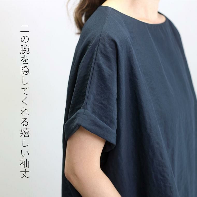 マットな艶感とシボ感のある薄手のボイル生地。風にふわっと 揺れる軽やかな着心地でとっても涼やか。しわになりづらく、お洗濯後そのまま着られる手軽さも嬉しい。見た目は上品なのにお手入れはとっても簡単で、なにかと忙しい大人女性におすすめです。シルエットは体のラインを拾わないゆったりドルマンで体型カバーにも期待。二の腕をカモフラージュし腕を細みせしてくれるワンロール袖や、すっきり女性らしいボートネックなど、シンプルながらも「華奢」へと導くこだわりを凝縮。シンプルで着まわし力にも優れ、オンオフ問わず活躍してくれる一着です。