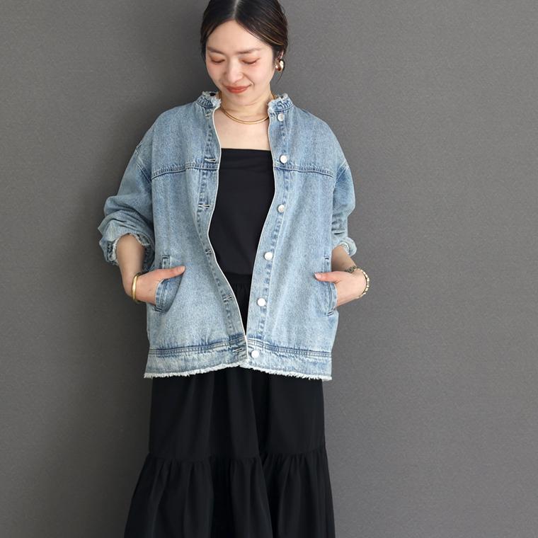 ウォッシングしたような風合い豊かなデニム素材のジャケット。襟、袖口、裾にあしらわれたフリンジデザインがシンプルなシルエットのアクセントに。襟元はバンドカラーデザインを採用しすっきりとした印象。ノーカラーなのでカットソーの他にもフード付きトップスも合わせやすいです。シルエットはゆったりとして楽な着心地で、トップスとも楽に重ねられます。着丈も長すぎなく、コーデしやすいシルエット。きれいめスタイルのカジュアルダウンアイテムとしてもおすすめです。