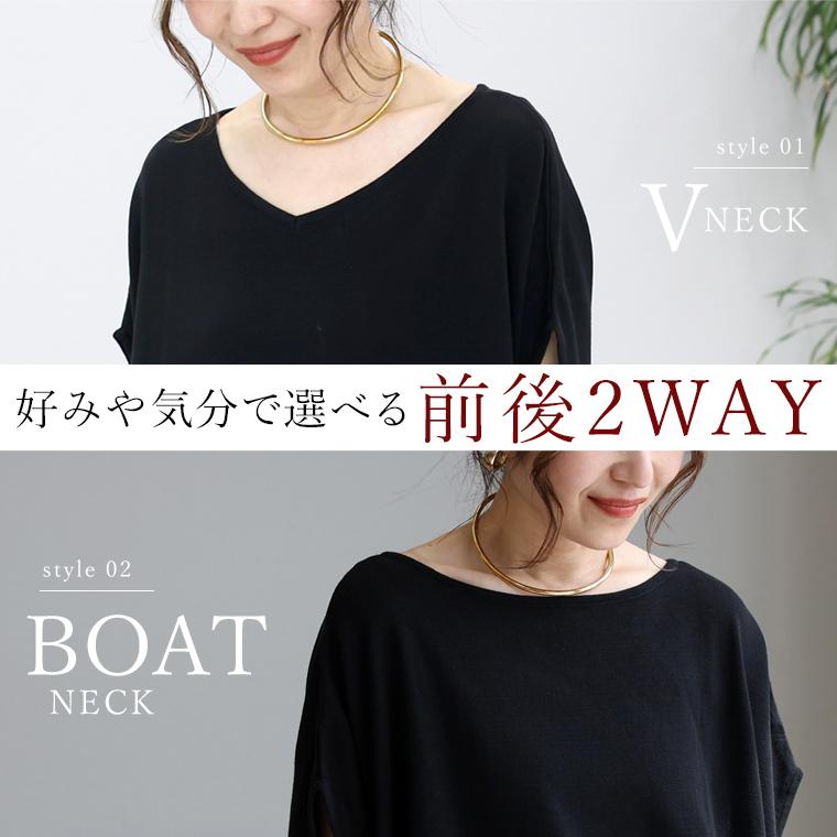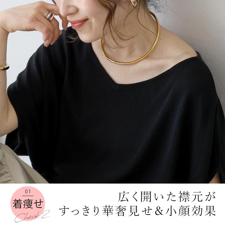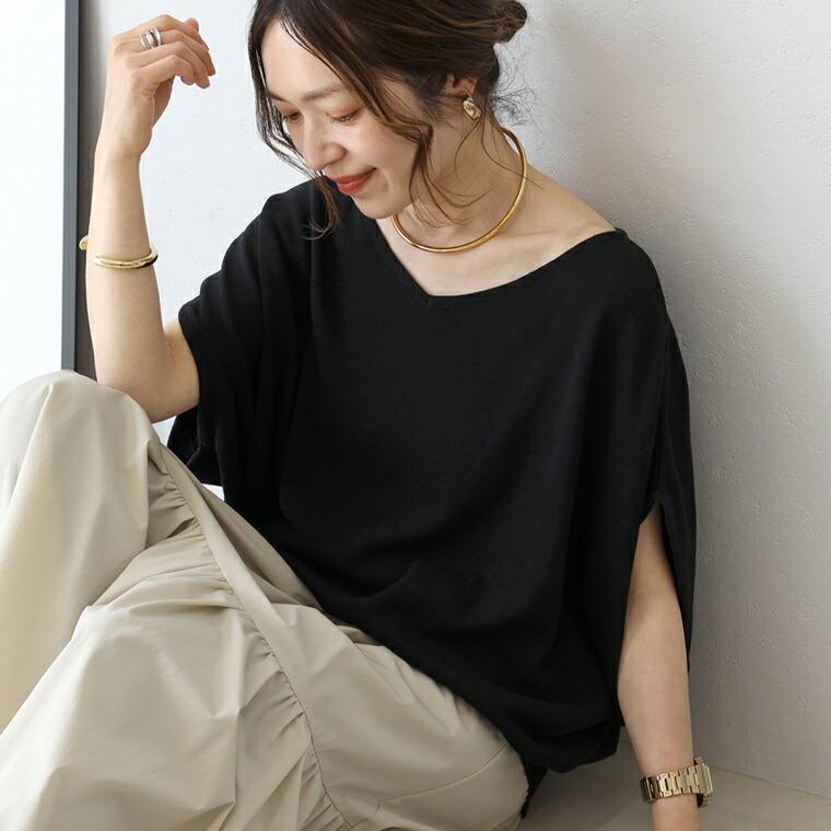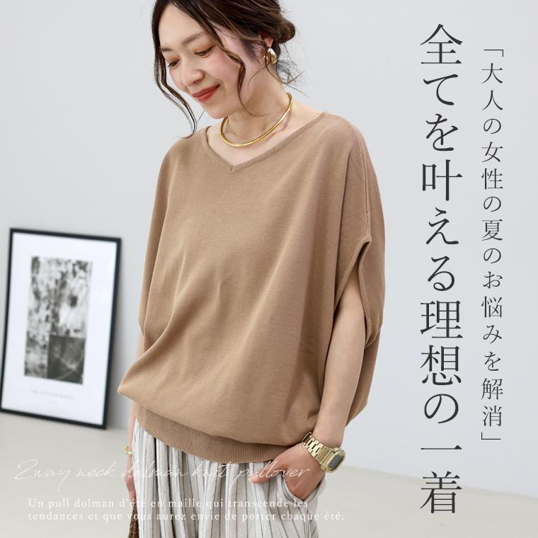 「着痩せ・着心地・着回し」大人の女性の夏のお悩みを解消する優秀プルオーバーの登場です。ボディーラインを拾わずゆったり着られるドルマンシルエットで着心地リラクシング。ゆとりのあるサイジングながらも、裾に向かって自然に窄まるコクーンなラインですっきり、どんなボトムともバランスよく着られます。大人女子から支持が高いボートネックとVネックの前後2wayで、お好みで着替えられるのが嬉しい。程よく開いた襟周りは女性らしさと抜け感を誘います。綿を織り込んださらりとした肌触りのハイゲージニットで、汗ばむ季節も快適に。