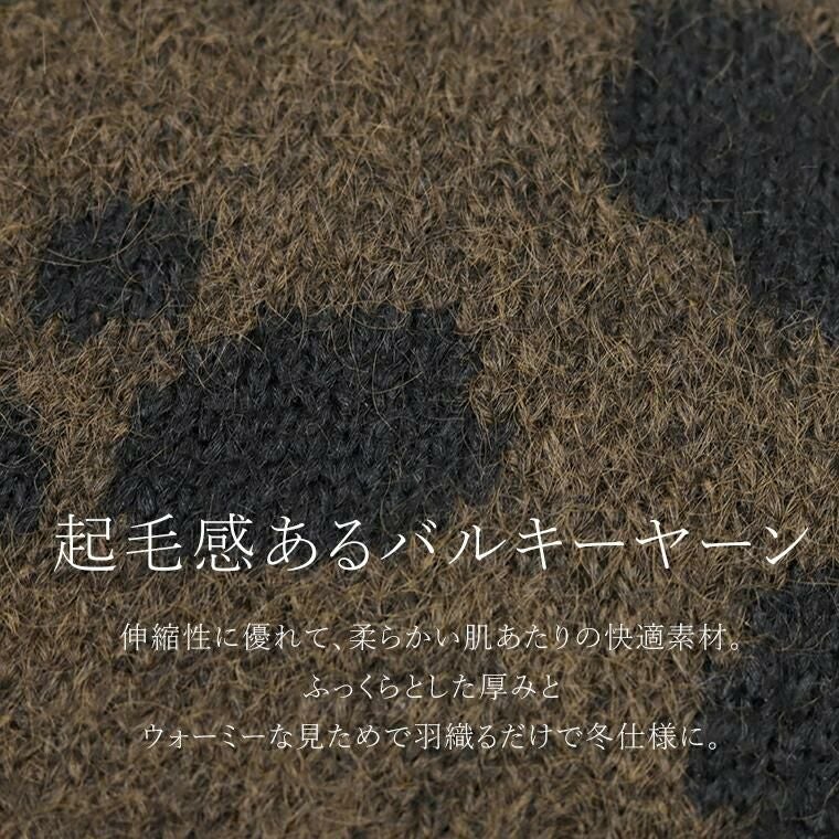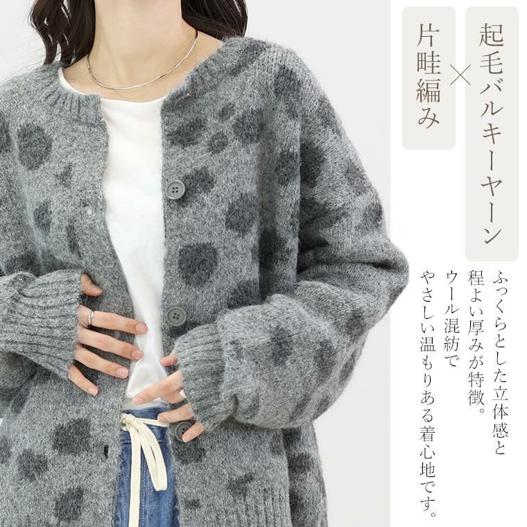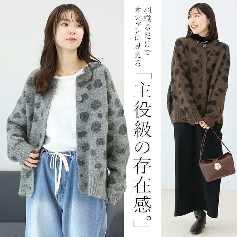 ダルメシアン柄がお洒落なニットカーディガン。起毛バルキーヤーンと片畦編みで、ふっくらとした立体感をつくり、羽織るだけでサマ見えします。軽くて伸縮性に優れているから普段使いにもぴったり。やや長めの着丈で腰まわりも暖かな着心地、ゆったりとしたシルエットだから重ね着も楽にできます。主役級の存在感がありながらも、バイカラーでまとめらた総柄なので、きれいめにもカジュアルにも合わせやすいです。