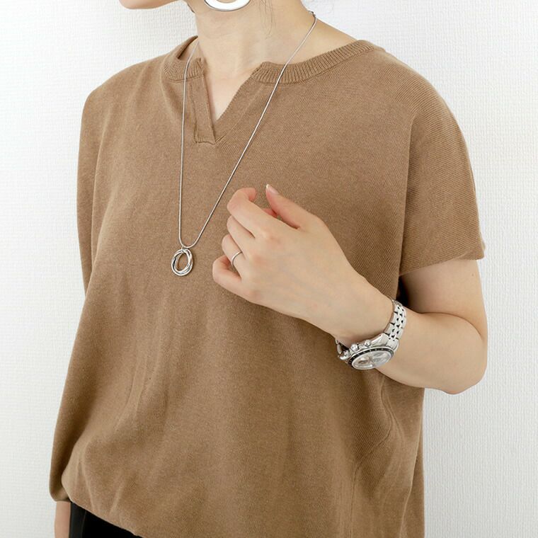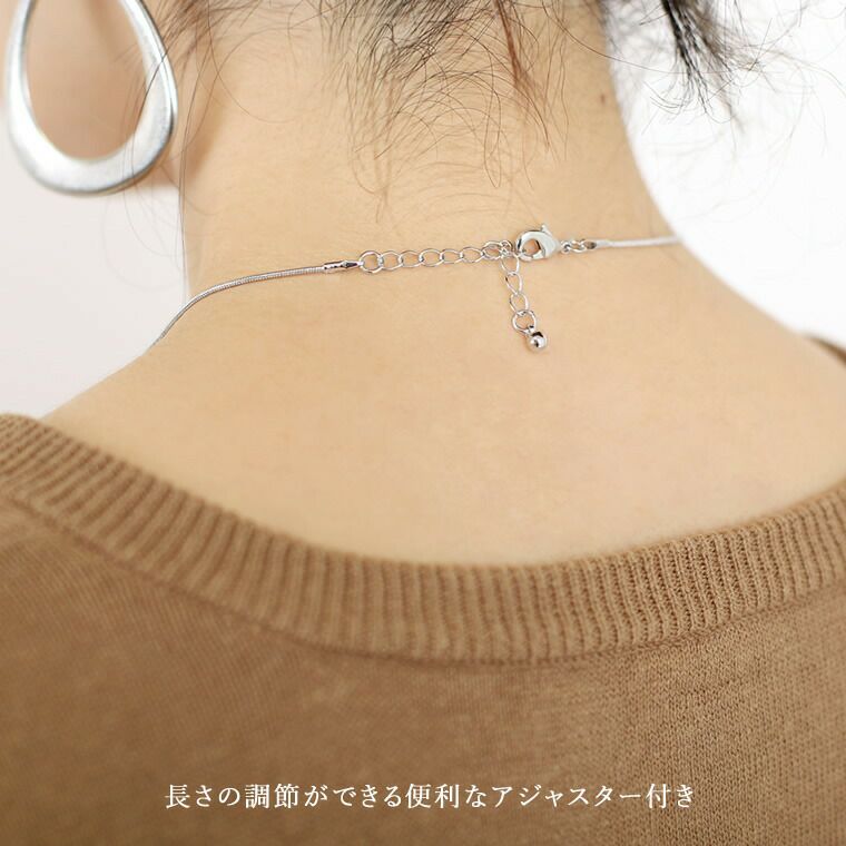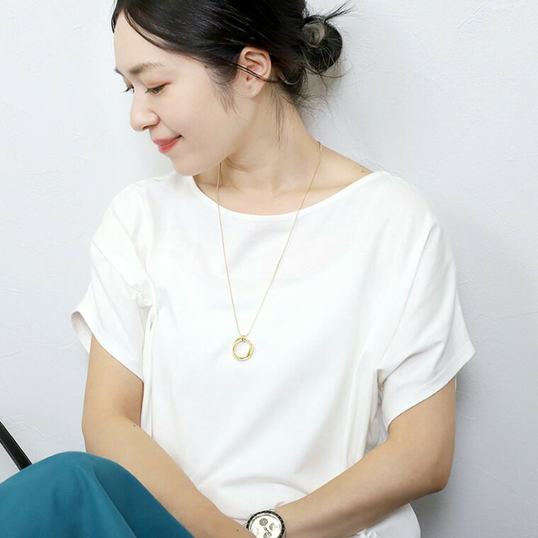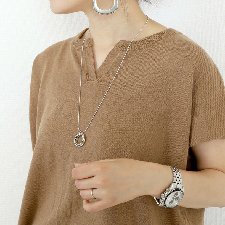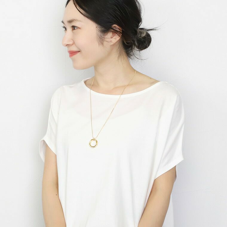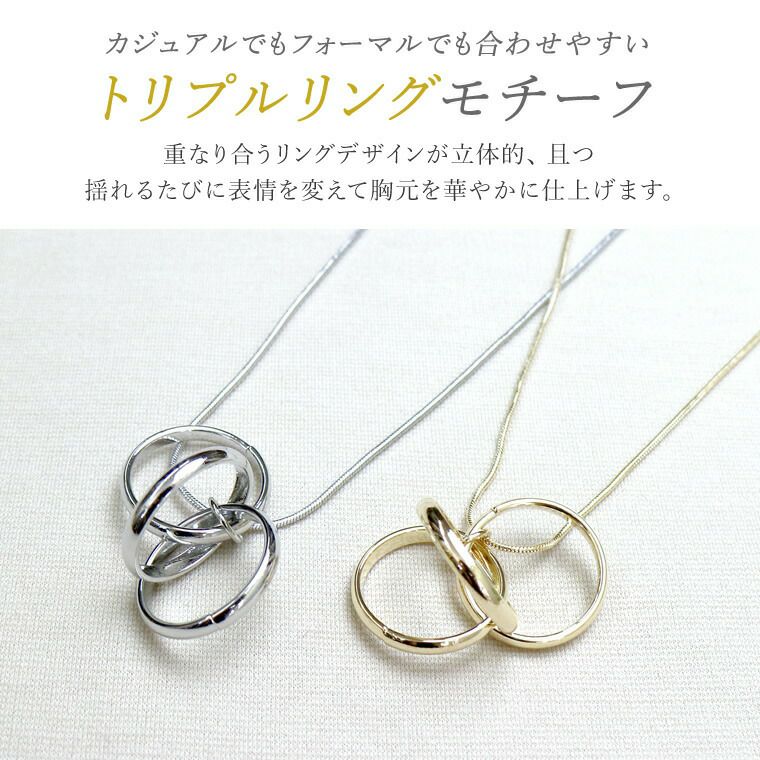 ツイストリングモチーフネックレス 3つのリングが重なり合う、リングモチーフのネックレス。 ツイストされたデザインが、光の角度によって煌き 様々な表情をみせてくれ、大人っぽく上品な印象に。 胸元まで揺れる立体感あるリングモチーフがトップスに華やぎを与えてくれます。 チェーンには便利なアジャスター付きで、トップスに合わせて長さ調整可能です。