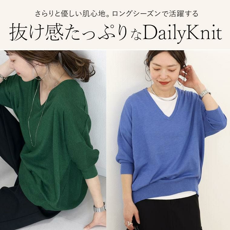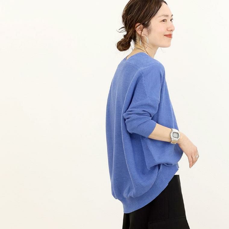 さらっと優しい肌触りで長いシーズン楽しめるデザインニット。前はベーシックな天竺編み、お袖と後ろをガーター編みに切替え、のっぺりしがちな無地ニットにメリハリと表情をプラス。両Vネックや後ろ下がりの丈など、後ろ姿も抜かりのないディテールで定番ボトムに合わせるだけでもお洒落に決まります。体のラインを気にせず着られるゆるっとしたドルマンシルエットで着痩せ効果にも期待できます。