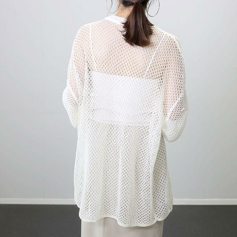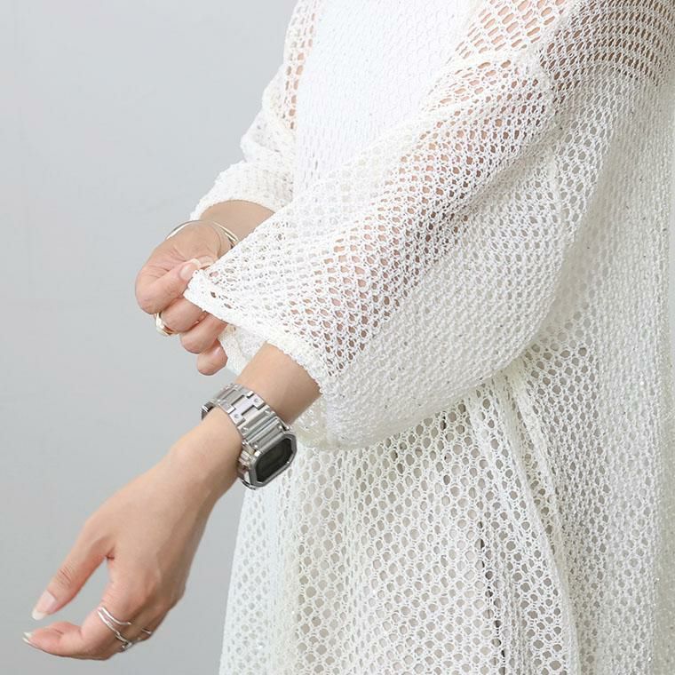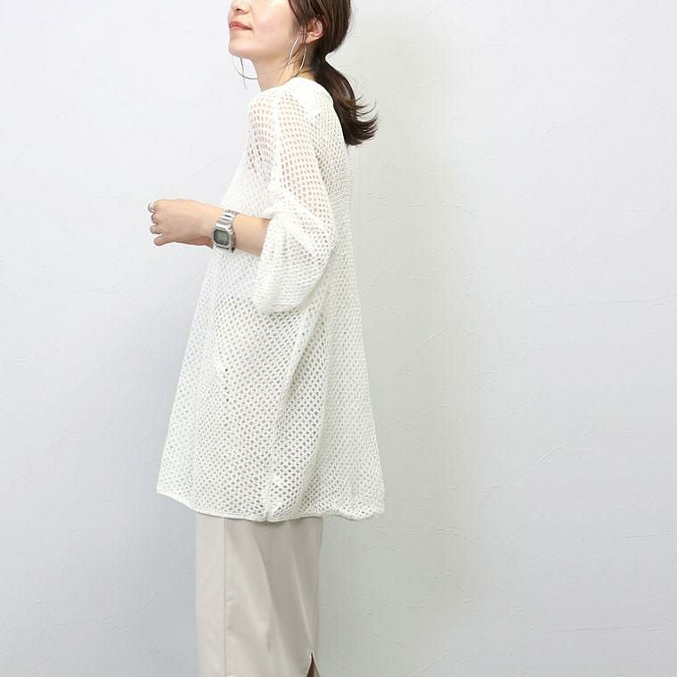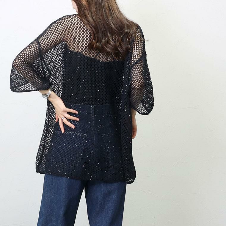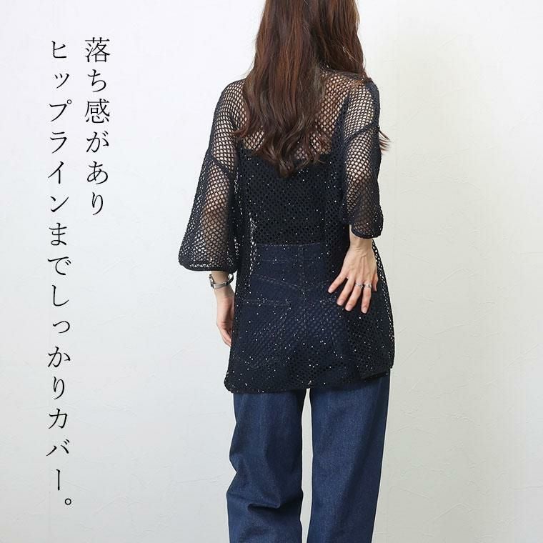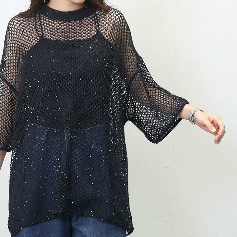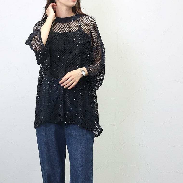 ざっくりとしたトレンドのメッシュにスパンコールを散りばめたニットチュニック。ゆるい編地にラフなシルエットがこなれ感を演出。リラクシーなサイジングにやや詰まり気味のクルーネックが好バランス。風を通す素材感で涼しく着られつつ、気になるボディーラインをカモフラージュしてくれます。落ち感があり、ヒップラインまでしっかりカバー。リラックス感とトレンド感を兼ね備えたトップスです。