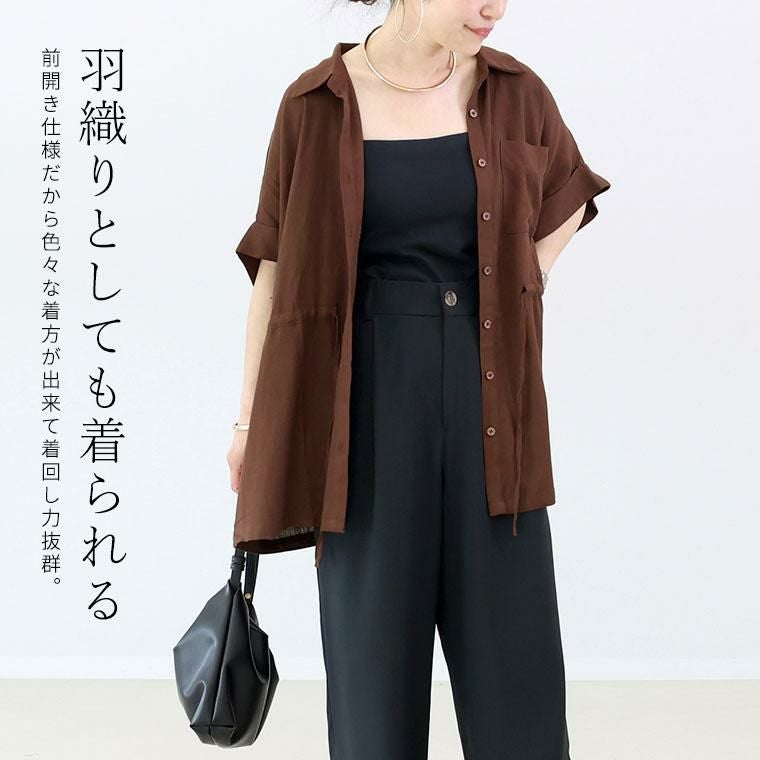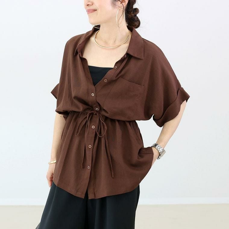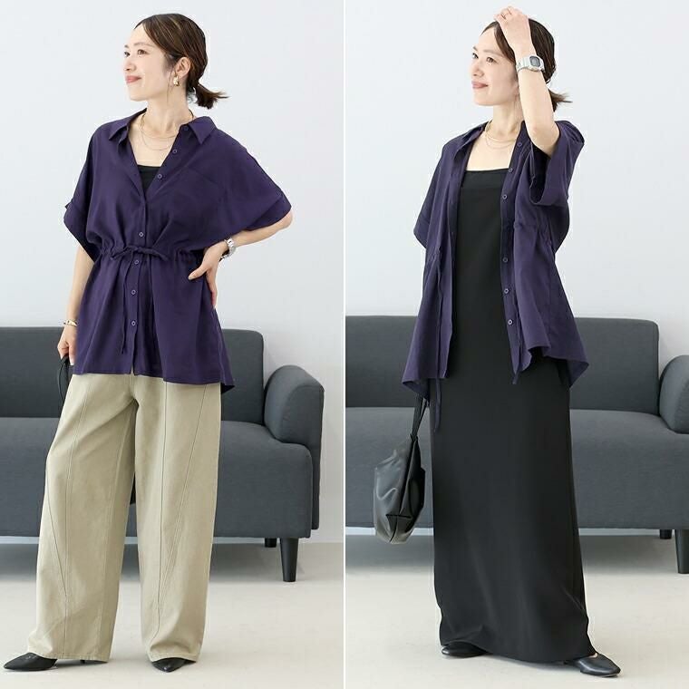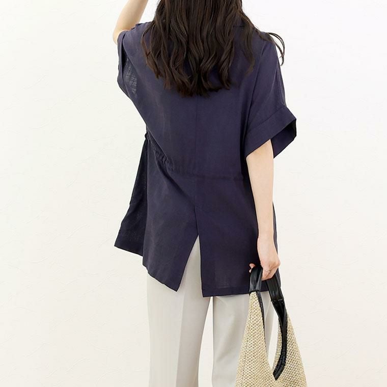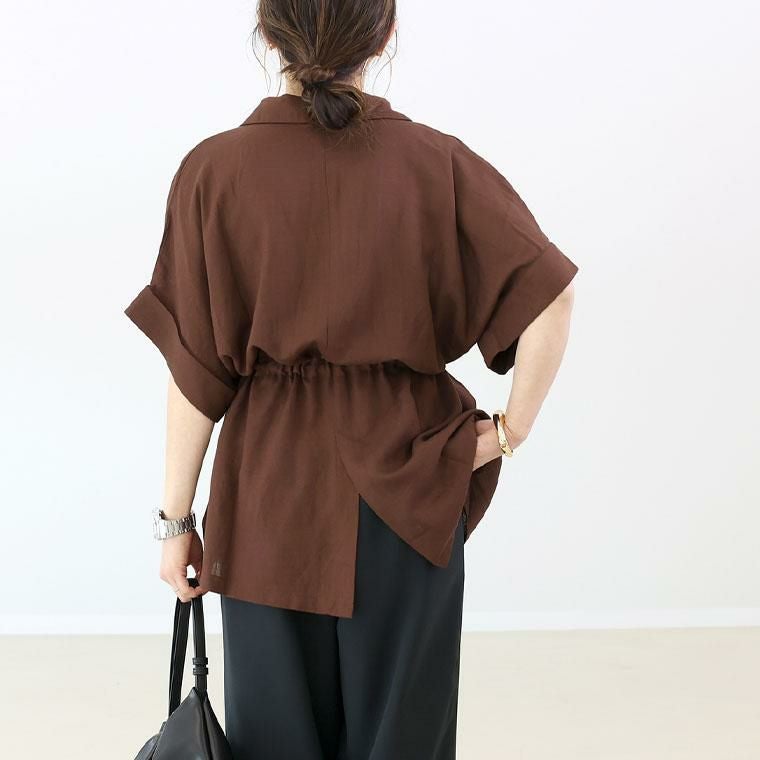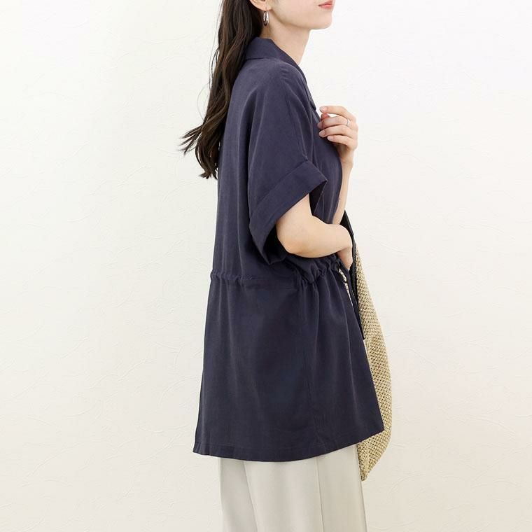 レーヨン×リネンの上質ブレンドで、しなやかさとナチュラル感を両立する素材感。さらりと涼やかな着心地で、春夏にぴったりの快適さです。シャツ襟できちんと感があり、カジュアルにもきれいめにも対応。ウエストはドロスト仕様で、シルエット調整も自由自在。ゆったりとしたドルマンスリーブが、二の腕をふわりとカバーし、ゆとりのある身幅が大人の余裕を感じさせるシルエット。太ももまで隠れる着丈で、体型の悩みをさりげなくフォローします。前開き仕様だから羽織としても着られて着回し力抜群。ロールアップの袖口は、上と下で糸で留めてあるので形を気にせず着用出来ます。左胸ポケットがさりげないアクセント。後ろ身頃のスリットが、動きに合わせて美しく揺れ、抜け感を演出。きちんと感とカバー力に優れた1枚です。