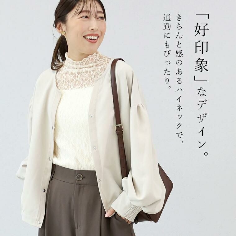 上品なレース素材で、顔まわりを華やかに見せるボトルネックプルオーバー。 繊細なレースとストレッチ性のある生地が、上質感と快適な着心地を両立します。程よく体に沿うシルエットで、インナー使いにも重ね着にもすっきり決まる万能デザイン。メロー仕上げの襟・袖・裾がさりげない甘さを添え、オフィスにもデイリーにも活躍。春夏はキャミソールやサロペットに、秋冬はシャツやニットのインに合わせて、一年中着回せる大人のきれいめレーストップスです。