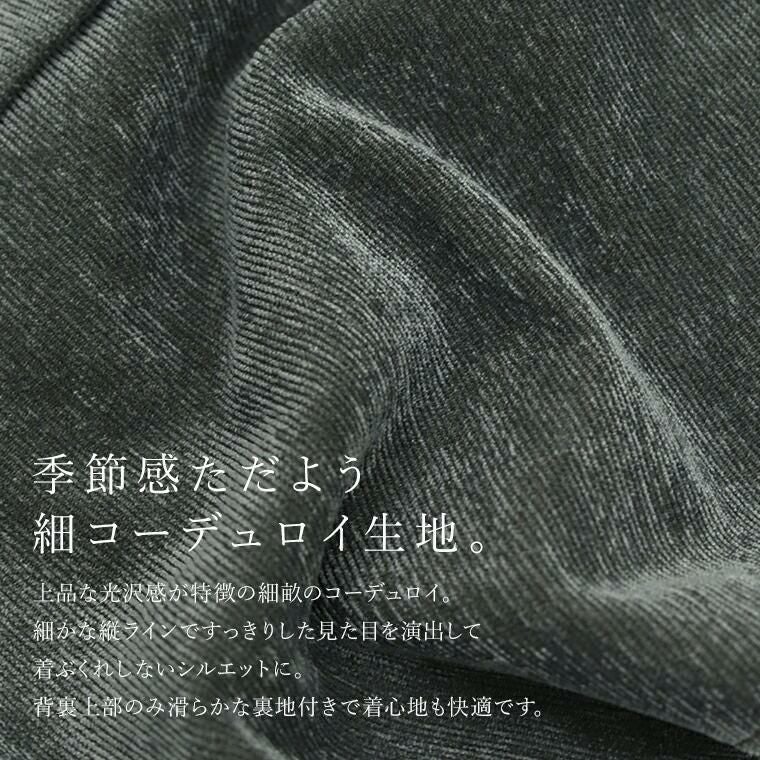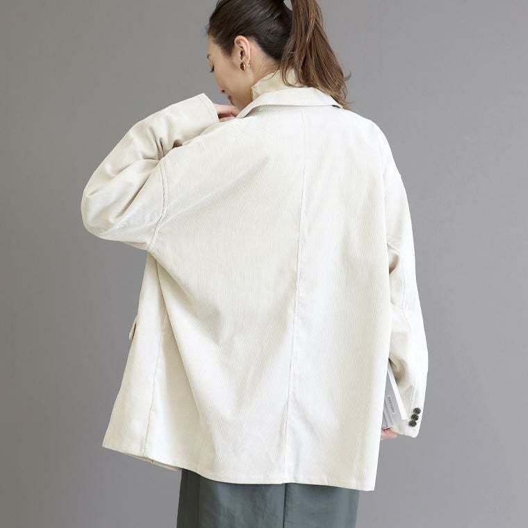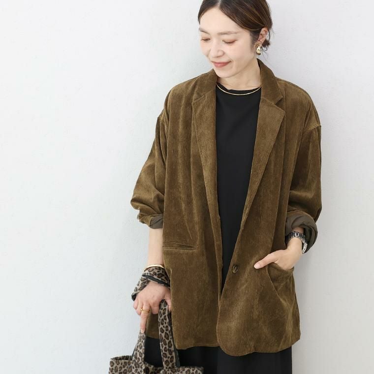 細畝が上品な印象のコーデュロイ生地で仕立てたジャケット。シングルブレスト&テーラード仕立てで洗練された印象です。やや小さめの襟と深めVラインで顔まわりすっきり、スコッチボタンがアクセントとなります。ドロップショルダーデザインのワイドシルエットがこなれた雰囲気です。カフス切替なしのミニマルなデザインなので、カジュアルな着こなしにもぴったりです。裏地は背裏上部のみで季節の変わりめから着られ、季節感と大人のこなれ感を演出できます。