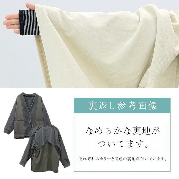 着丈はヒップから3cm下。袖丈は手首から12cm下。程よくゆとりのあるサイズ感で長めの着丈です。袖口はやや緩めです。全体的にゆとりがあるので中に厚手の物も重ねられそうです。