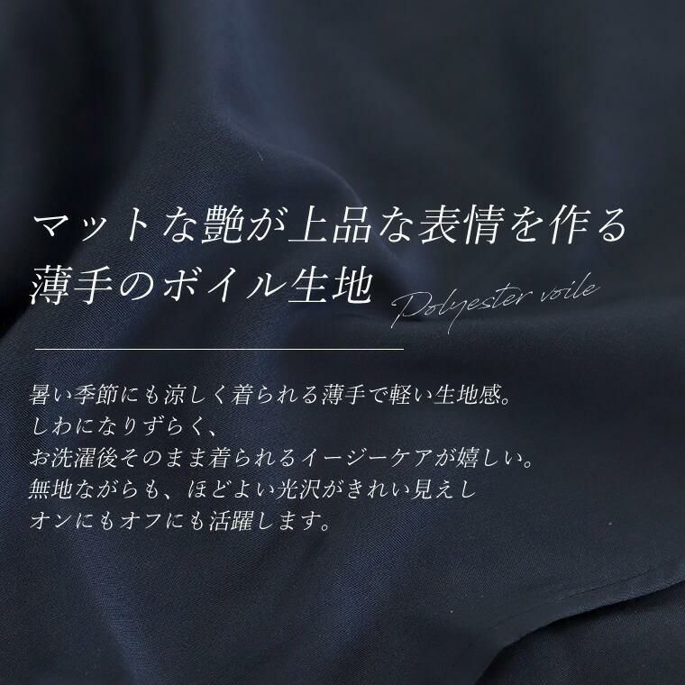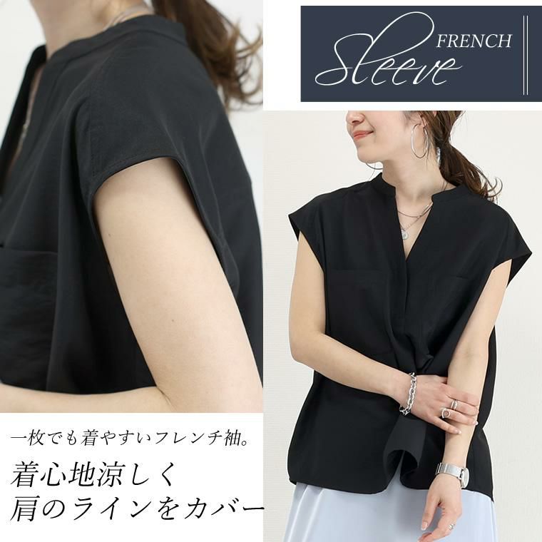 両ポケフレンチスキッパーブラウス さらりとした肌触りでほどよい光沢のあるエステルボイル生地で仕立てた 夏ブラウス。風にふわり揺れる薄手素材で、軽く涼しい着心地。 しわになりづらく、お洗濯後そのまま着られるイージーケアも嬉しいポイントです。 シャープな肌見せがハンサムな表情をみせるスキッパー襟は、大人の抜け感を演出。 頭からすぽっと被るだけできれいなVを描いてくれる、こだわりの襟元デザインです。 フロントの両ポケットもアクセントになっています。肩の出過ぎないフレンチスリーブは 大人が一枚でも着やすく、羽織りを重ねた時ももたつきにくい人気のシルエット。 暑い季節までしっかり活躍するサマーブラウスです。
