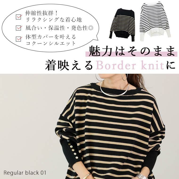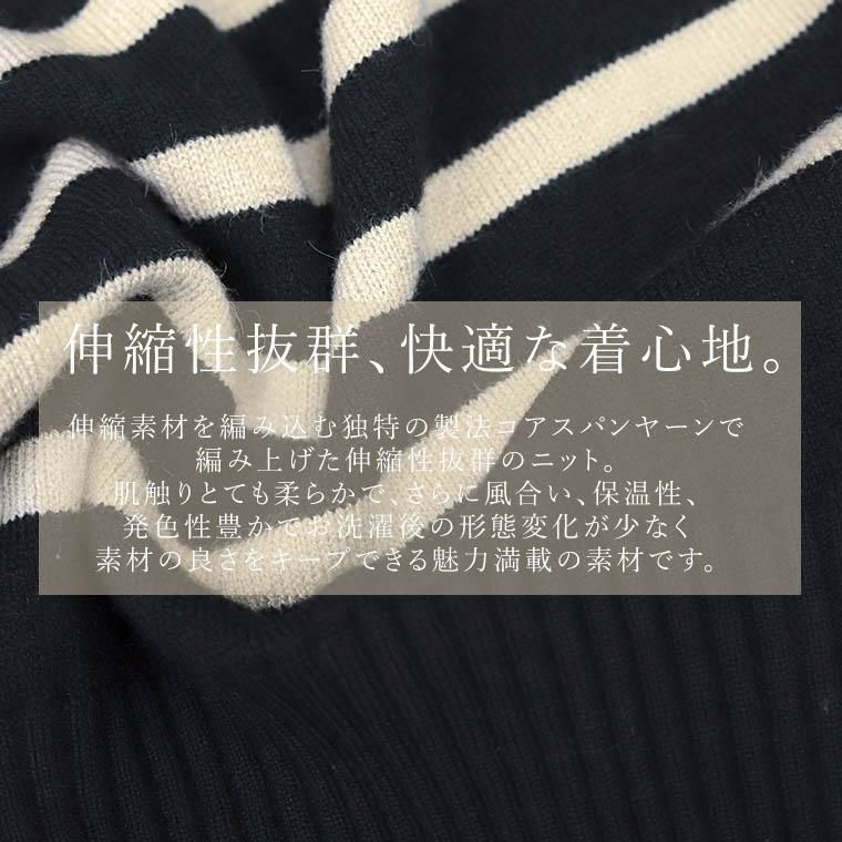 肌触りにもデザインにもこだわったオリジナルニットのボーダーバージョン。ボーダー幅と色合いが絶妙バランスな大人が着やすいレギュラーボーダーとパネルボーダーの2種類をご用意。好みに合わせて選ぶことができ、カジュアルなスタイルはもちろん、きれいめにもマッチする大人デザインです。伸縮素材を編み込む独特の製法で編み上げたストレッチ性抜群のニットで着心地リラクシング。さらに、風合い・保温性・発色性も豊かでお洗濯後の形態変化が少なく素材の良さをキープできる魅力満載の素材です。華奢みせボートネック×腰回りをしっかりカバーするコクーンシルエットの大人の女性に人気のディテールを凝縮。安心感のあるシルエットでボトムも選びません。旬のレイヤードスタイルにも頼れる、着心地快適なストレッチニットです。