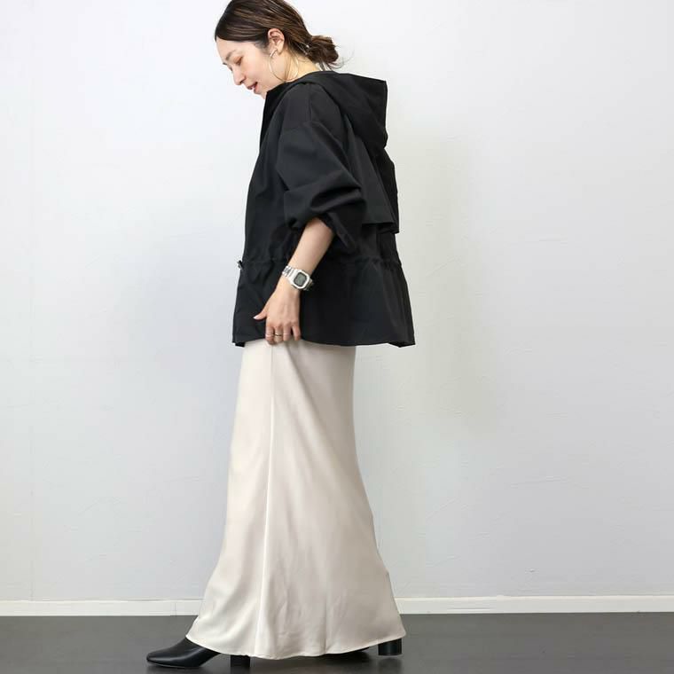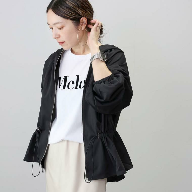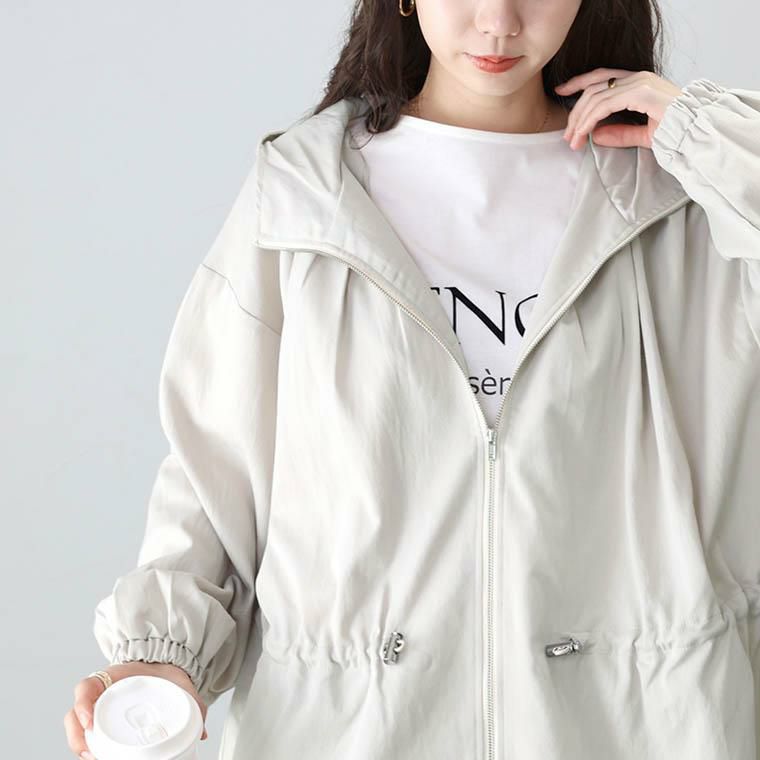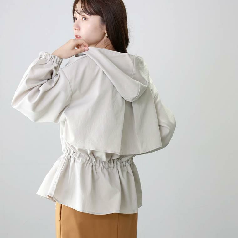 季節の変わり目や室内での冷房対策など、さっと羽織るのに便利なライトアウター。薄手の布帛生地でさらり軽い着心地です。ウエストのドロストでシルエットを変えられるデザインが魅力。ドロストを絞らずシンプルに羽織るのはもちろん、きゅっと絞ればペプラム風のデザインに。裾に向かってふんわり広がるシルエットが可愛く、スタイルアップ見せしてくれます。さらに立体フードは小顔効果も。抜け感を誘い、後ろ姿のアクセントに。メンズライクなアイテムに女性らしさを落とし込んだこだわりの一着です。
