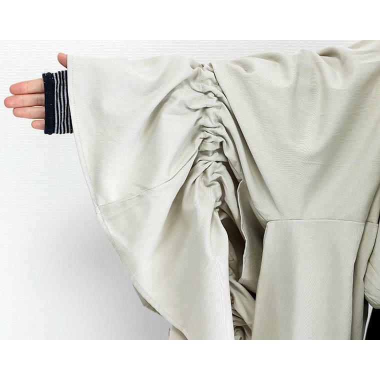 着丈はヒップが少し出るくらい。袖丈は手首から8cm下。アウターですが薄手なので重さは気にならず軽い着心地です。ドロストで色々なシルエットにできコーデの幅が広がって良いですね。袖口がゴムになっているので腕まくりしやすいです。