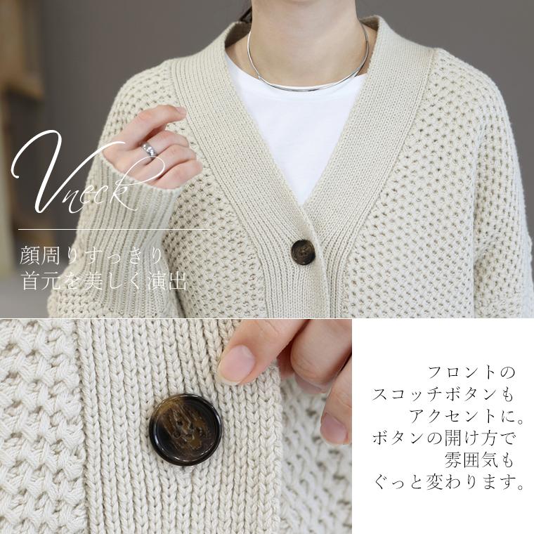 ローゲージの鹿の子編みがほどよい厚みと立体感を表現するゆるシルエットのVネックカーディガン。ざっくりとした編地とルーズなシルエットが見せる今っぽい抜け感が、羽織るだけでこなれた雰囲気を演出します。ゆったりとしたシルエットながらも、Vネックやリブ使いでシルエットにメリハリを効かせ、すっきりと着られるのもこだわり。さらに着丈を長めに設定することで、腰周り安心&暖か。ボトムに合わせてゆるっとブラウジングした着こなしもおすすめです。素材は綿を多く織り込んだしっとりとした風合い。ニットならではのチクチク感もなく、ストレスなく着ていただけます。