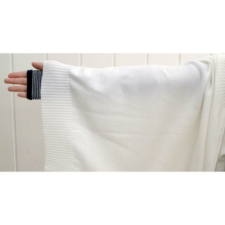 着丈はヒップが少し出るくらい。袖丈は手首から12cm下。ゆったりしていて着心地が楽です。袖が少し長く感じました。袖口と裾のリブは柔らかくて窮屈感はありません。