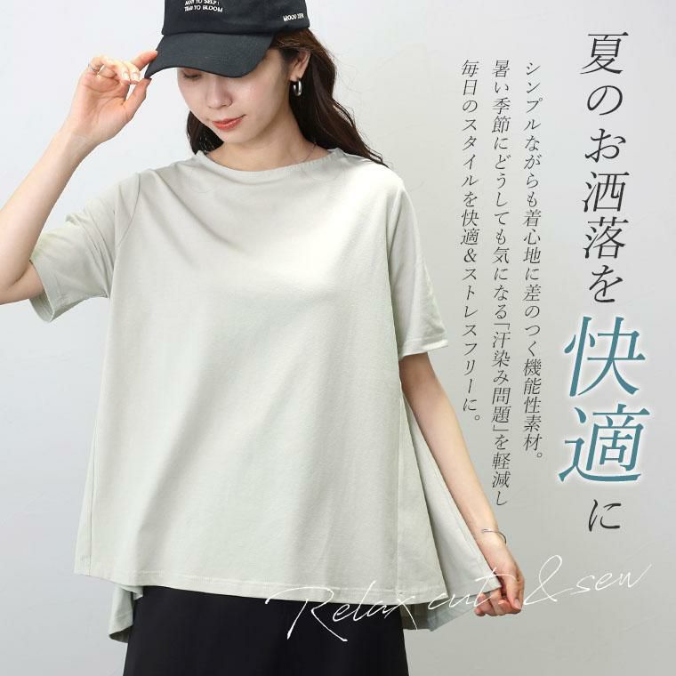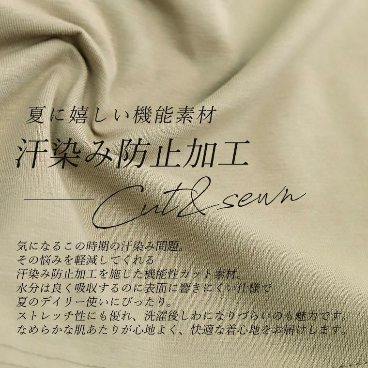 この時期にどうしても気になる汗染み問題…。そんなお悩みを軽減してくれる汗染み防止加工を施した機能性カットソーの登場です。水分は良く吸収するのに表面に響きにくく、汗ばむシーンでもストレスなく過ごせます。(ページの下部の動画もぜひご覧ください。) ストレッチ性にも優れ、洗濯後シワになりづらいのも嬉しいポイントです。シルエットは、裾に向かって綺麗に広がるAライン。後ろ着丈を長めに設定し、お腹まわりからヒップにかけてすっぽりカバー。タイトめなボトムとも上品に合わせられます。色にもこだわったカラー展開。汗染みを気にして色選びを迷わない!夏に大活躍する有能アイテムです。