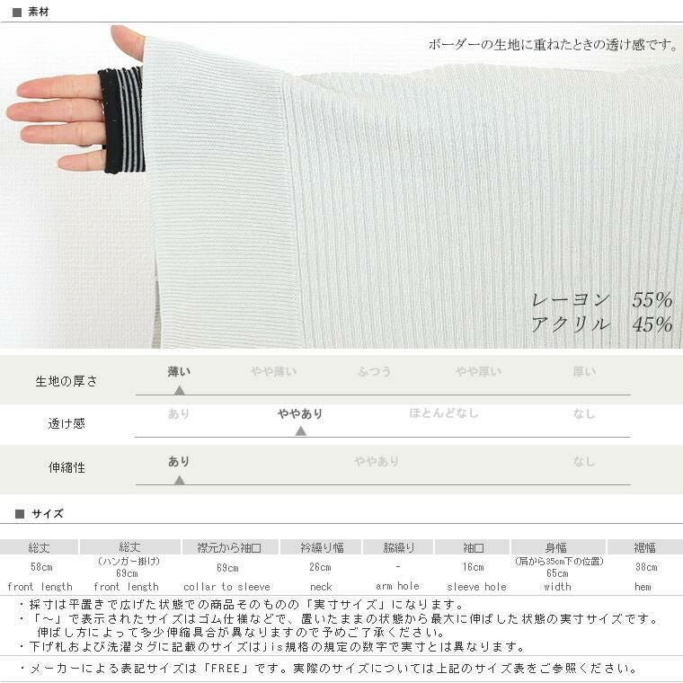 着丈はヒップから7cm下。袖丈は手首から13cm下。春先や秋口など季節の変わり目に◎な薄手のニットです。裾を伸ばすとヒップを隠してくれますが、裾が程よくフィットしてくれるので自分のいい位置で着丈を調節できます。袖が長めですが袖口リブが長く丁度いいフィット感なので、裾と同じようにいい位置で止まります。透け感が少しありました。