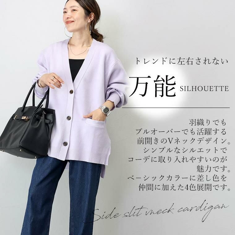 羽織りでもプルオーバーでも活躍する前開きのVネックカーディガン。ボタンを開けてさっと羽織ればこなれ感をアピールしながら体型カバーができ、ボタンを閉じてインナーを重ねればプルオーバーとしても使える便利な2wayデザインです。流行りに左右されないシンプルさも魅力。サイドのスリットと前後差のある着丈で、ボトムに重ねるだけでバランスよく着こなせるのもこだわりです。さらに、広めの身幅にシャープな襟元がメリハリを誘う。顔周りをすっきりみせ、女性らしい抜け感を演出します。ベーシックなカラー展開に差し色がポイント。色違いでワードローブに揃えたくなる一枚です。