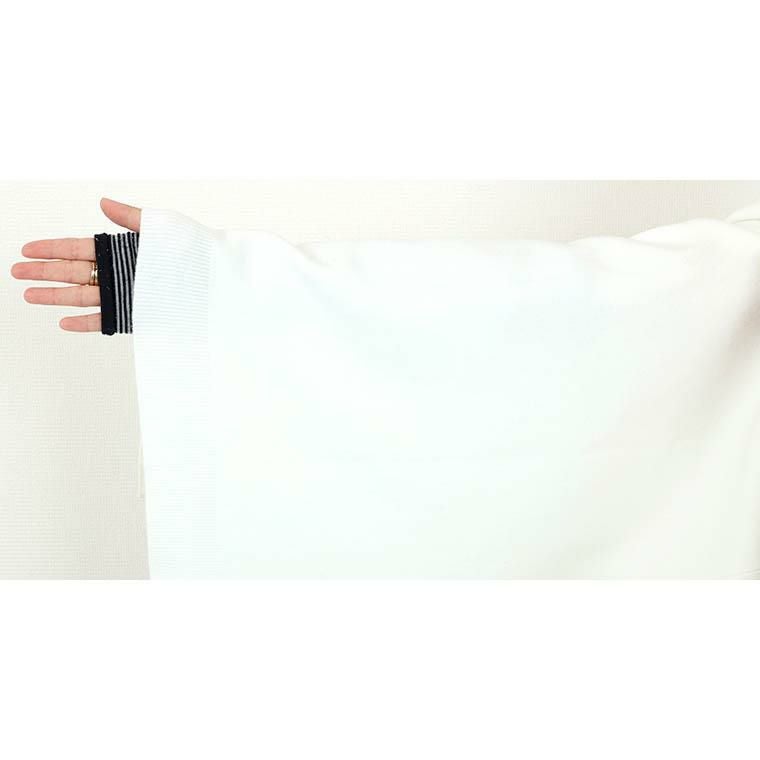 着丈はヒップから12cm下。袖丈は手首から25cm下。持った時は重みを感じましたが着るとそんなに気になりませんでした。身幅のゆったりさがとても良く、厚手の物の上からでも羽織れるゆとりがあります。袖がかなり長めなので、私のように腕の短い方はたくし上げて着た方がいいと思います。モチモチっとしていて伸縮性もあり着心地◎。