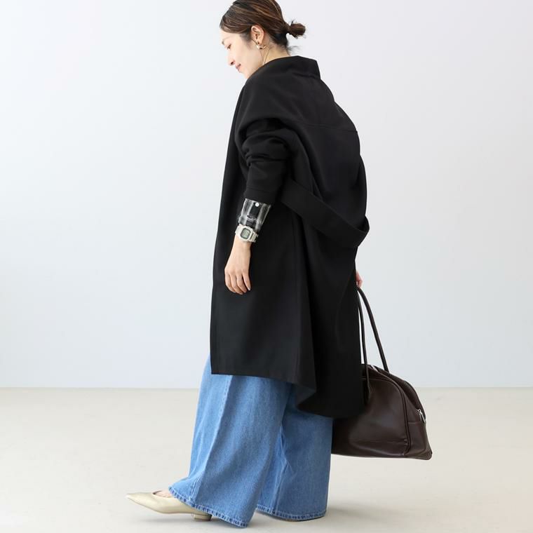 襟元に特徴のある変形シルエットのコーディガン。後ろからフロントにかけて生地をたっぷりと使った襟まわりのデザインが大人な女性のムードを高めクラシカルな雰囲気に。肩のラインを小さくみせるドロップショルダーで、華奢見せ効果も。さっと羽織るだけでこなれるこだわりのシルエットが自慢です。こちらのコーディガン、ミディアム、ロングの2レングスをご用意。好みや身長に合わせてセレクトすることでよりジャストな着心地を楽しんでいただけます。生地は柔らかく軽いメルトン素材。秋から春までたっぷり活躍するザインコーディガンです。