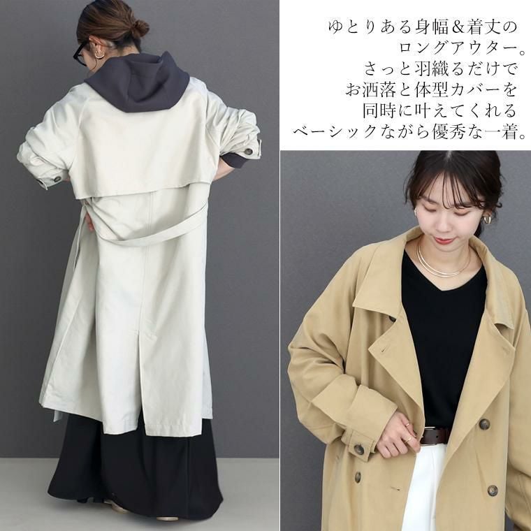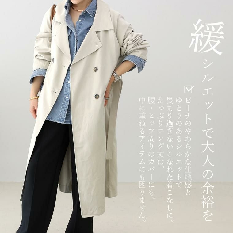 コート トレンチ トレンチコート ロングコート ロングアウター アウター ロング ライトアウター 羽織り はおり 羽織 防寒 季節の変わり目 体型カバー 日焼け対策 日焼け防止 ひやけたいさく ひやけぼうし ひよけ クーラー対策 冷房対策 温度調節 気温調節 ピーチ マット キレイ見え きれいめ キレイめ 綺麗め 上品 楽ちん ラグラン テーラード ダブル ゆるめ ゆったり ゆるめ ボタン アンブレラヨーク アンブレラ ベルト スリット リラックス おしゃれ お洒落 体型カモフラージュ 大人め ベージュ ダークベージュ グレージュ カラバリ豊富 大きめ 大きい ワンマイルウエア ワンマイルウェア レディースファッション 無地 ラクチン らくちん 楽ちん 動きやすい プラスサイズ 着痩せ 華奢見え 脚長 脚長効果 ゆったりサイズ ゆる すっきり カバー 体型カバー きちんと シンプル カジュアル ナチュラル ベーシック オフィス オフィスカジュアル テレワーク 会議 食事会 ランチ 女友達 参観日 二次会 飲み会 上品 知的 女性らしい 女らしい 着映え オンライン飲み会 着回し 大人 大人カジュアル オトナ 女性 綺麗 きれい キレイ キレイめ 高見え 上質 大きいサイズ 細見え 女性服 アースカラー フリーサイズ 楽 ノンストレス 動きやすい ゆったり 高級感 母の日 プレゼント ギフト 贈り物 S M L LL 2L XL 20代 30代 40代 50代 おしゃれ パ―ト バイト 仕事 仕事用 ユニフォーム 春夏 春 夏 秋冬 秋 冬 お洒落 オシャレ かわいい 可愛い カワイイ かっこいい カッコいい FUNNY COMPANY ファニーカンパニー ふぁにーかんぱにー ファニカン