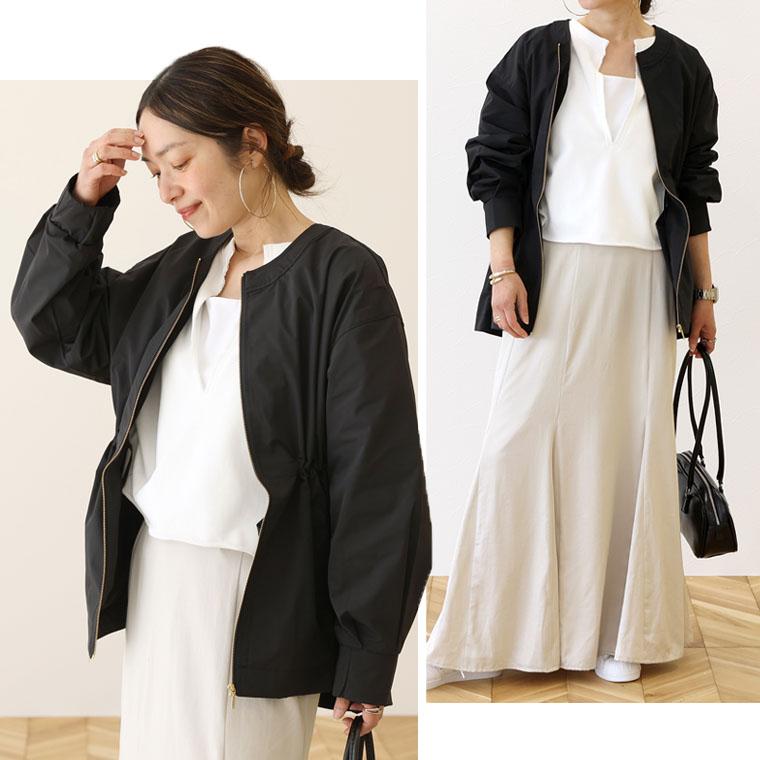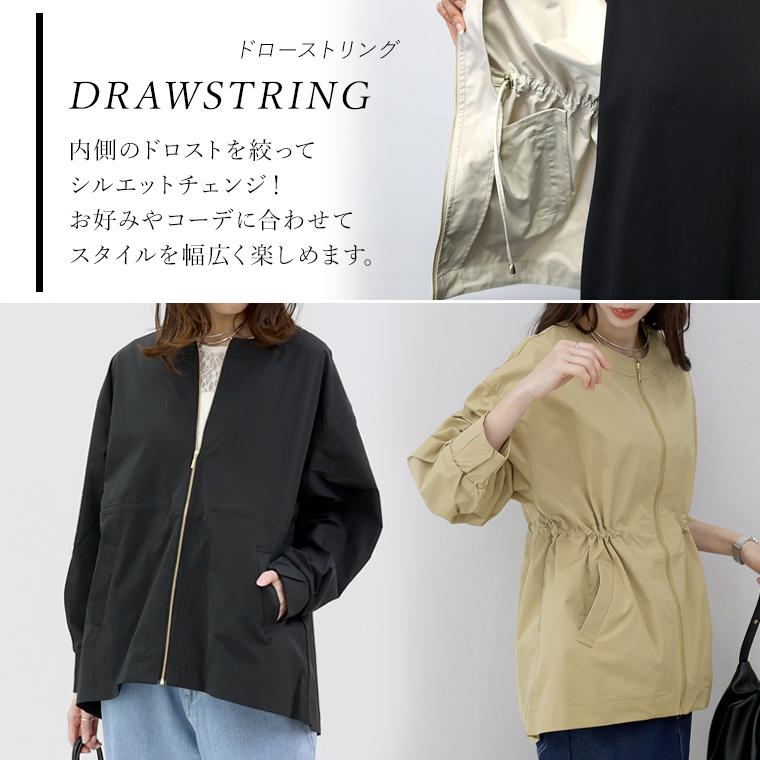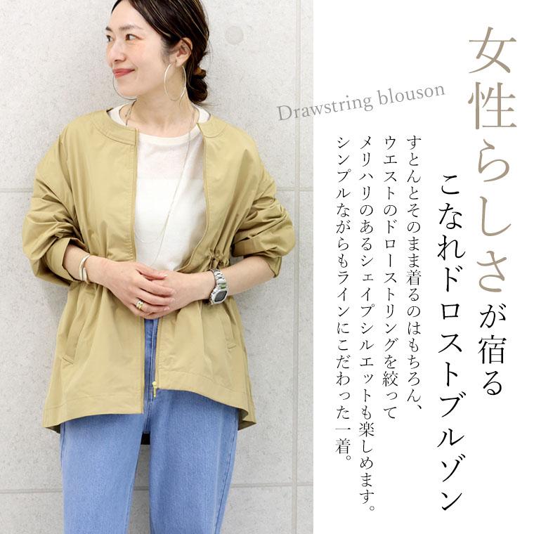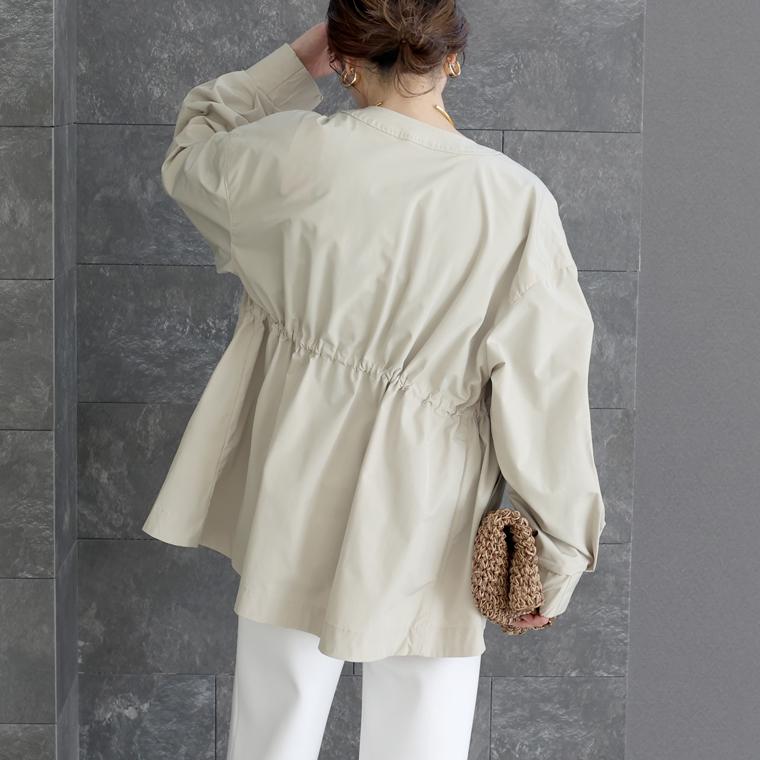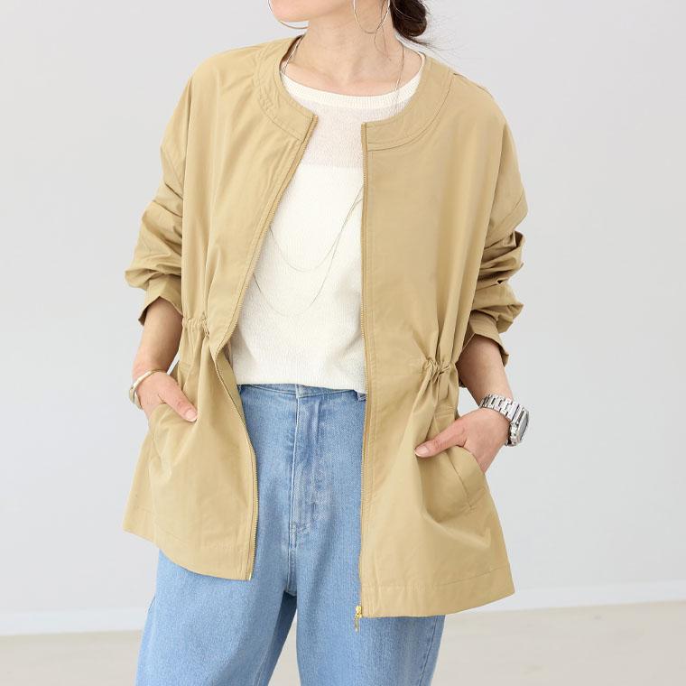 さっと羽織れてデイリーの着回しに重宝するライトアウター。程よいハリのあるマットな生地で、適度な立体感とストレスフリーな軽さが特徴です。ウエストの内側にはドローストリングが施されており、きゅっと絞ることでシルエットのアレンジが可能。合わせるアイテムや好みに応じて着方を楽しむことができ、背の高い方から小柄な方までバランスよく着られます。襟元は抜け感のある開き具合にこだわったノーカラー。ステッチの切替が女性らしいアクセントになっています。しっかり長めの着丈で実用性に優れ、腰・ヒップまわりの体型カバーにも役立ちます。オンオフ活躍する万能ブルゾンです。