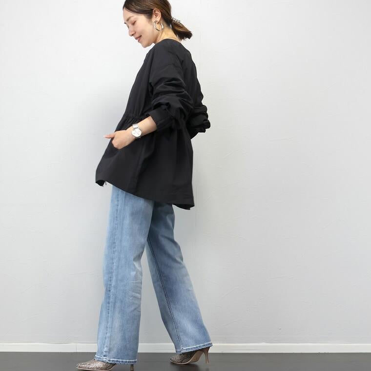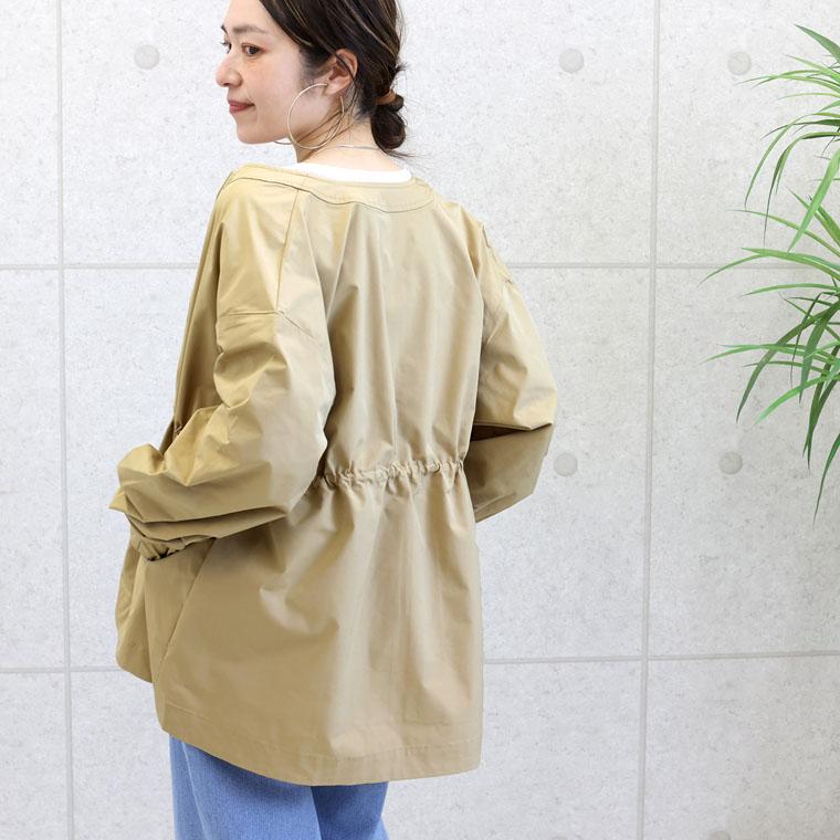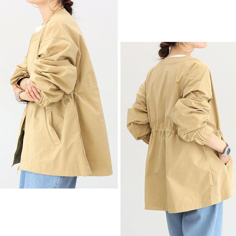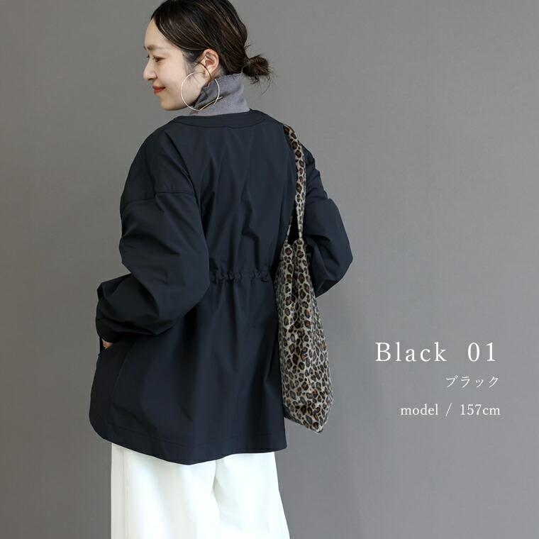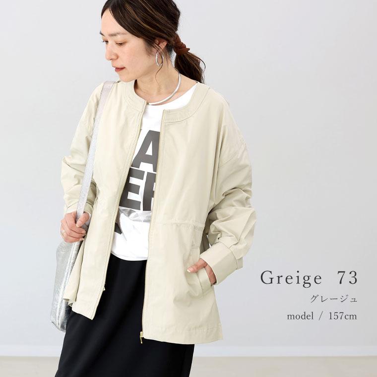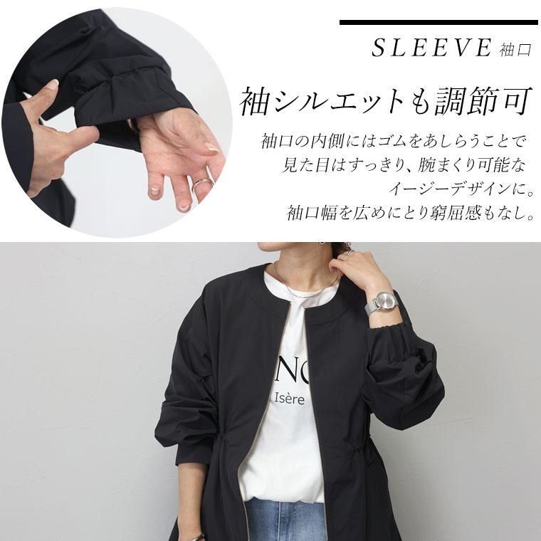 さっと羽織れてデイリーの着回しに重宝するライトアウター。程よいハリのあるマットな生地で、適度な立体感とストレスフリーな軽さが特徴です。ウエストの内側にはドローストリングが施されており、きゅっと絞ることでシルエットのアレンジが可能。合わせるアイテムや好みに応じて着方を楽しむことができ、背の高い方から小柄な方までバランスよく着られます。襟元は抜け感のある開き具合にこだわったノーカラー。ステッチの切替が女性らしいアクセントになっています。しっかり長めの着丈で実用性に優れ、腰・ヒップまわりの体型カバーにも役立ちます。オンオフ活躍する万能ブルゾンです。