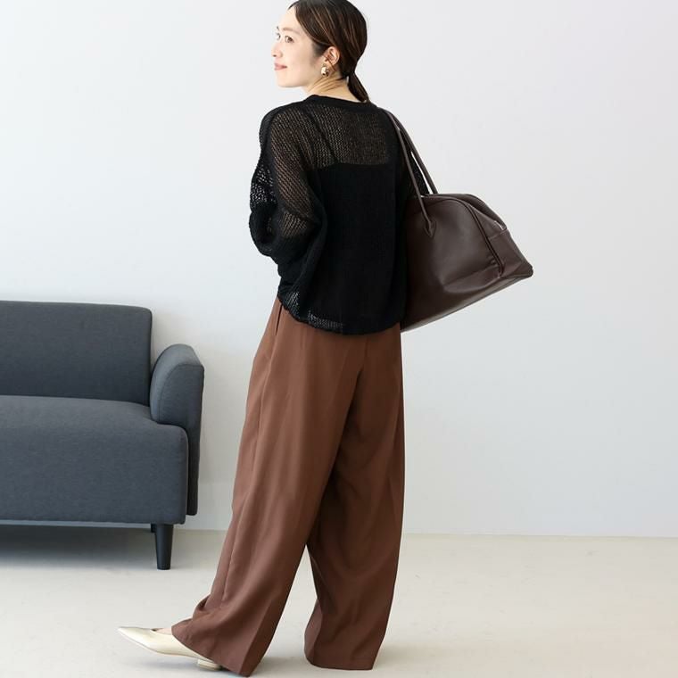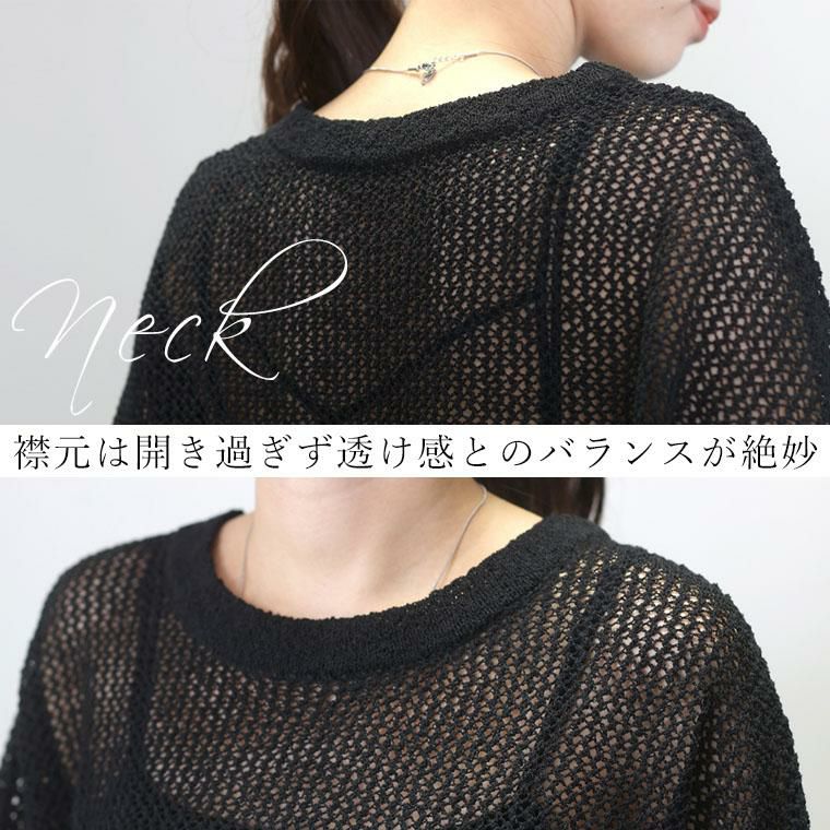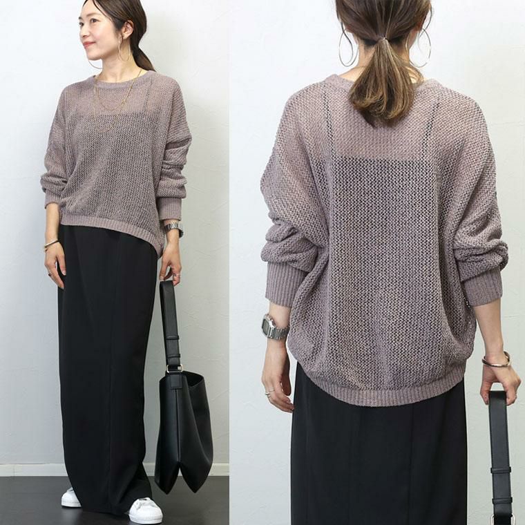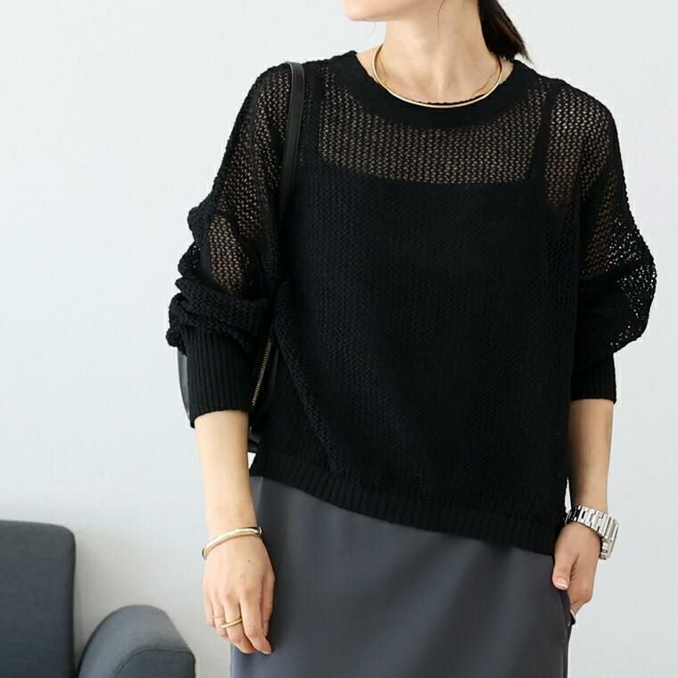 今季マストのメッシュを大人に似合う仕様に仕上げた長袖ニットの登場です。程よく細かい立体編み、さらに糸によりを加えることで品の良い透け感に。大人のシアースタイルにぴったりな雰囲気に仕上げています。さらりとしたポリニットで肌当たりのストレスなし、自宅でお手入れ可能なイージーケアも嬉しい魅力です。シンプルなデザインで、秋春はロンTと、夏にはタンクトップやブラトップをレイヤードして長い季節活躍。抜け感を生むゆとりあるシルエットや袖のボリューム感、ボトムに重ねるだけでサマになる計算された着丈など大人にとって着やすいポイントを凝縮しました。落ち着いたカラー展開で、トレンド感を楽しみながらも品よく着られる大人の為の一着です。
