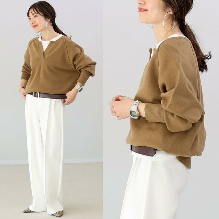 重ねキーネックが女性らしいミドルゲージニット。シンプルながらも上品なエフォートレススタイルを叶える大人の為の一着です。襟元の重ね襟がコーデのポイントに。重ね着をしてシャープな印象、レイヤードしてカジュアルアップといった汎用性の高さが魅力です。生地にはアンチピリング処理を施して毛玉ができにくい仕様。伸縮性に優れ、チクチクしなく滑らかな肌あたりが特徴です。ラグランスリーブとコクーンシルエットの組み合わせが絶妙で、着心地と見ための良さにこだわった、上品なリラックス感を実感できるプルオーバーです。