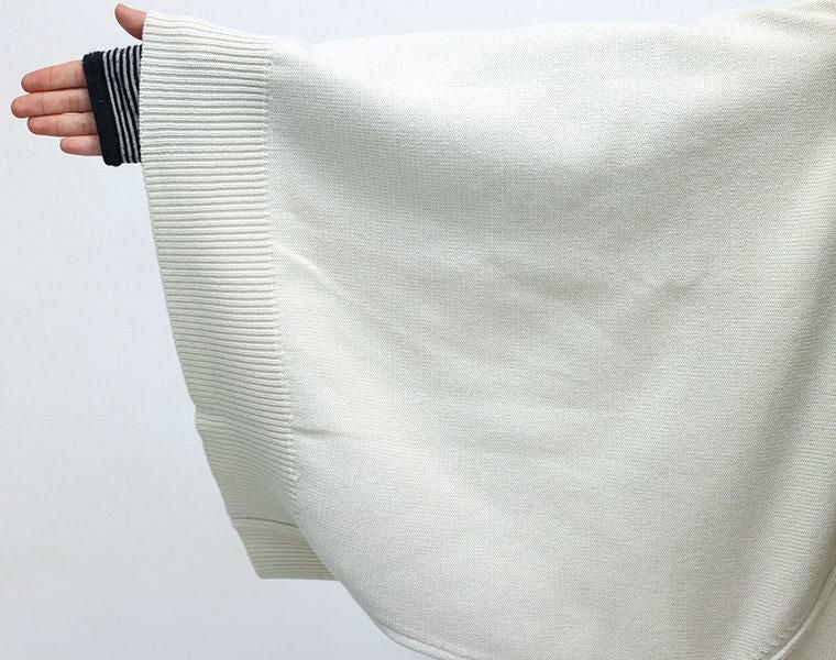 着丈はヒップから2cm下。袖丈は手首から23cm下。すごく伸縮性のあるニットで目が詰まっていて暖かいです。肌に触れてもチクチクしません。身幅がゆったりしていますが裾はリブになっていて小柄な方もゆとりを持って可愛く着れます。