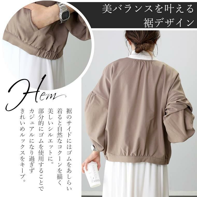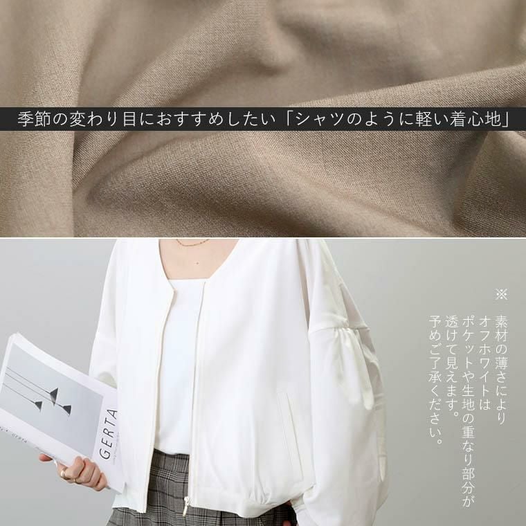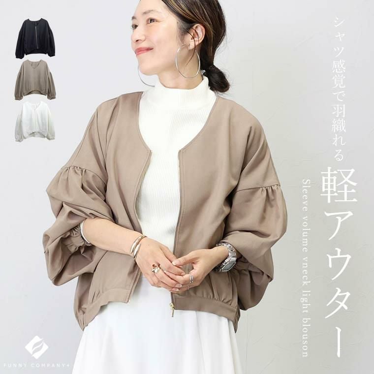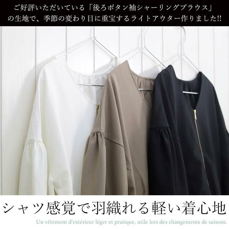 ブルゾン アウター ライトアウター 羽織り はおり 羽織 防寒 季節の変わり目 体型カバー 日焼け対策 日焼け防止 ひやけたいさく ひやけぼうし ひよけ クーラー対策 冷房対策 温度調節 気温調節 平織り 薄手 後ろボタン キレイ見え きれいめ キレイめ 綺麗め 上品 楽ちん 袖ボリューム 袖デザイン タック ギャザー Vネック ゴールド 金 ファスナー ゴールドファスナー ゆるめ ゆったり ゆるめ コクーン リラックス おしゃれ お洒落 体型カモフラージュ 大人め ブラック ぶらっく 黒 モカ 白 オフホワイト ホワイト カラバリ豊富 大きめ 大きい ワンマイルウエア ワンマイルウェア レディースファッション 無地 ラクチン らくちん 楽ちん 動きやすい プラスサイズ 着痩せ 華奢見え 脚長 脚長効果 ゆったりサイズ ゆる すっきり カバー 体型カバー きちんと シンプル カジュアル ナチュラル ベーシック オフィス オフィスカジュアル テレワーク 会議 食事会 ランチ 女友達 参観日 二次会 飲み会 上品 知的 女性らしい 女らしい 着映え オンライン飲み会 着回し 大人 大人カジュアル オトナ 女性 綺麗 きれい キレイ キレイめ 高見え 上質 大きいサイズ 細見え 女性服 アースカラー フリーサイズ 楽 ノンストレス 動きやすい ゆったり 高級感 母の日 プレゼント ギフト 贈り物 S M L LL 2L XL 20代 30代 40代 50代 おしゃれ パ―ト バイト 仕事 仕事用 ユニフォーム 春夏 春 夏 秋冬 秋 冬 お洒落 オシャレ かわいい 可愛い カワイイ かっこいい カッコいい FUNNY COMPANY ファニーカンパニー ふぁにーかんぱにー ファニカン