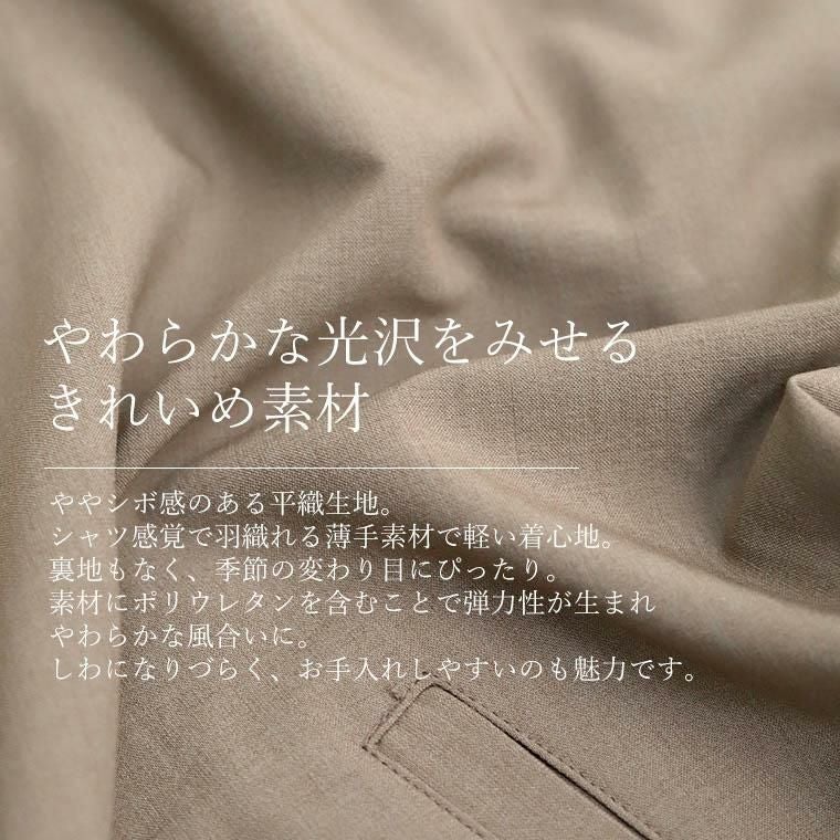 ご好評いただいている「後ろボタン袖シャーリングブラウス」の生地で仕立てたライトアウターです。アウターにしては薄手で軽い生地を採用することで、季節の変わり目にさっと羽織るのに便利な風合いに。フロントは顔周りをすっきりみせるVネック。開けても閉めてもサマになり、ハイネックなど首元の高いインナーとも相性抜群です。ふんわりボリュームのあるスリーブラインもポイント。袖の付け根にギャザーをあしらい立体的に。女性らしさが際立つだけではなく、視覚効果で体をコンパクトにみせ着痩せにも期待。袖口にはゴムをあしらい、腕まくりをしてボリュームの調節も可能です。パンツやスカート、ワンピースにも合わせやすい汎用性の高い着丈。季節の変わり目に長く活躍するアイテムです。