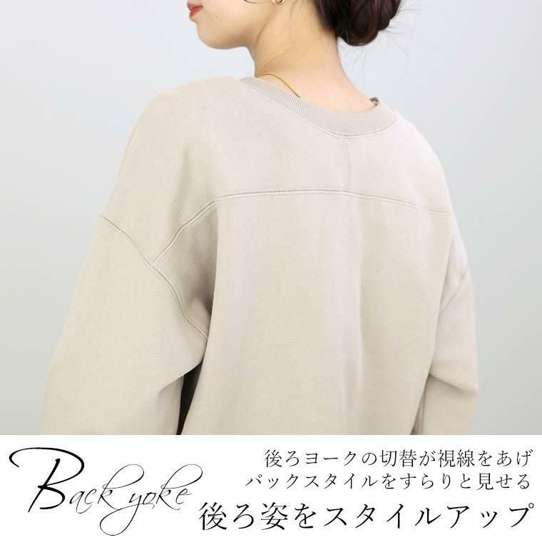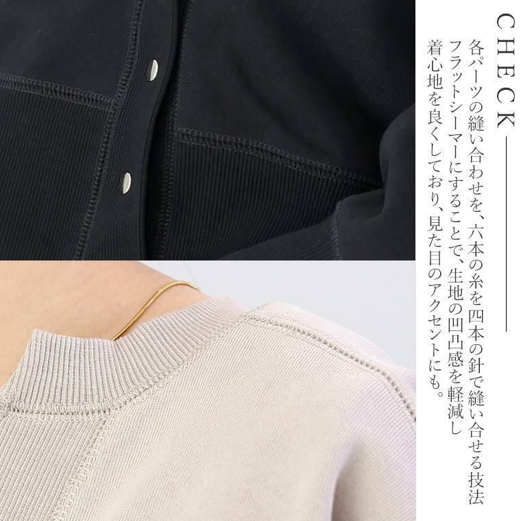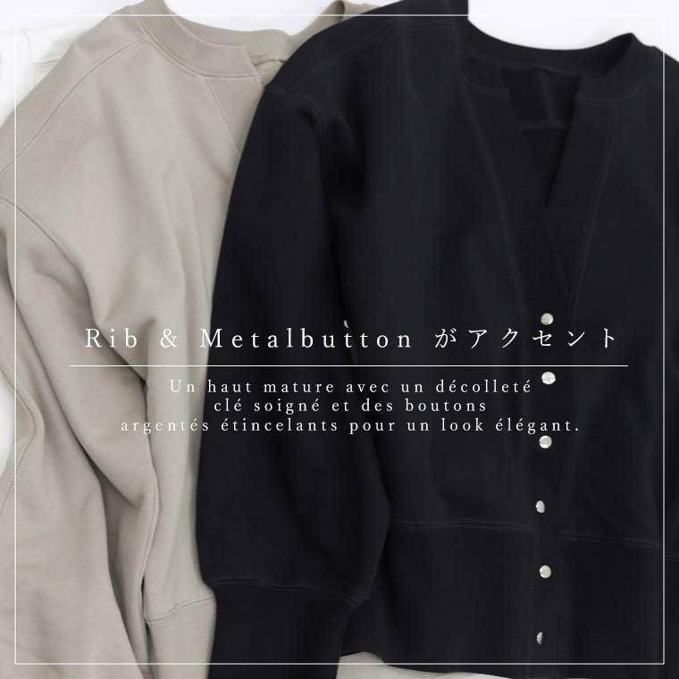 リブ使いとメタルボタンがアクセントの綿スウェットトップス。着るだけで顔周りをシャープに、上半身をコンパクトにみせるYラインの襟元が特徴。インナーを変えて様々な着こなしを楽しめるのも嬉しい。シルバーのドットボタンはクールな印象を与えます。生地は程よいハリ感と上質さを重視した綿100%のスウェット素材。毛玉になりづらく、しかも風合い良く肌にも環境にも優しい、デイリーに扱いやすい生地を選びました。ゆとりをもたせた身幅とドロップショルダーで着痩せを演出。後ろヨークの切替が視線を上げ、バックスタイルをすらりと見せます。パンツにもスカートにも合わせやすい、技ありデザイントップスです。