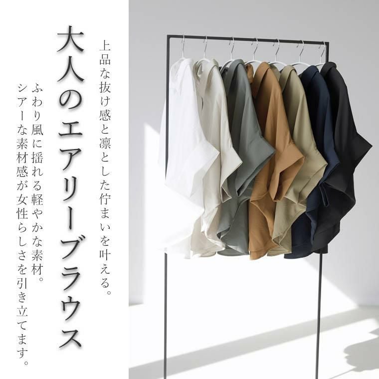 上品な抜け感、凛とした佇まいが一枚で手に入るエアリーブラウス。当店大人気「エステルローンスキッパードルマンブラウス」と同素材のエステルローン生地を採用。シボ感のある素材でシワを気にせず一日中きれい見えをキープ。薄手の軽やかな素材で、ふわりエアリーな着心地を実現しました。ご好評いただいている身幅や袖、バックデザインはそのままに、より着やすい丈感にアップデート。気になるラインをカバーし、ボトムにさっと重ねるだけでバランスの良い着こなしを完成します。フロントは前開き仕様で凛とした印象に。第一ボタンを敢えてつけないすっきりとした襟デザインで、大人の抜け感を誘います。自分らしいカラーが見つかる豊富な色展開も魅力です。