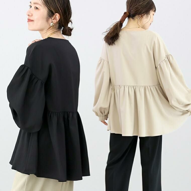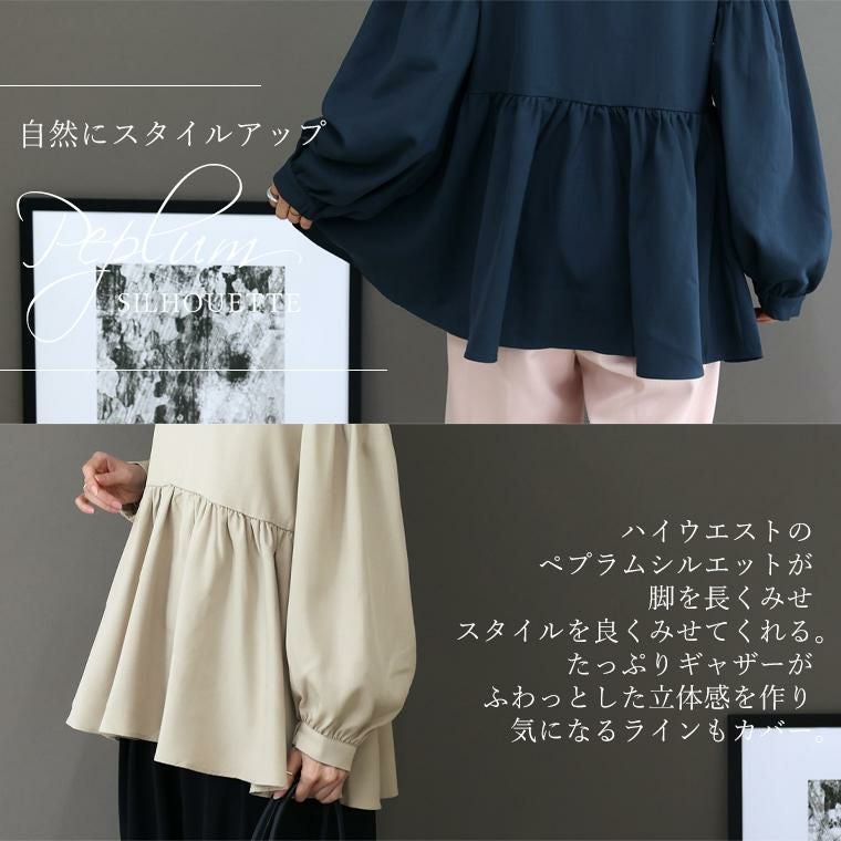 可愛らしさと上品さを兼ね備えた大人のためのフェミニンブラウス。程よいハリと光沢がきちんと見えする杢調の無地素材で、さりげない上質感を醸し出します。しわになりにくく、一日中きれいな印象をキープしてくれるのも魅力です。着るだけで自然にスタイルアップへと導く、ハイウエストのペプラムシルエットが華やか。たっぷりギャザーを寄せた贅沢な立体感がデザイン性だけではなく、気になるボディーラインのカバーにも効果的。ヒップの隠れる長めの着丈で安心感もあります。さらに袖はドロップショルダー×ボリュームの旬ディテール。腕まくりをしてボリューム感を自在に調節可能で、日常動作もノンストレス。洗練された大人の魅力を引き出す美人ブラウスです。