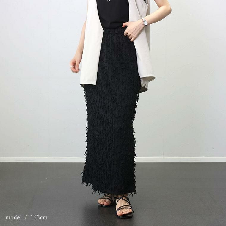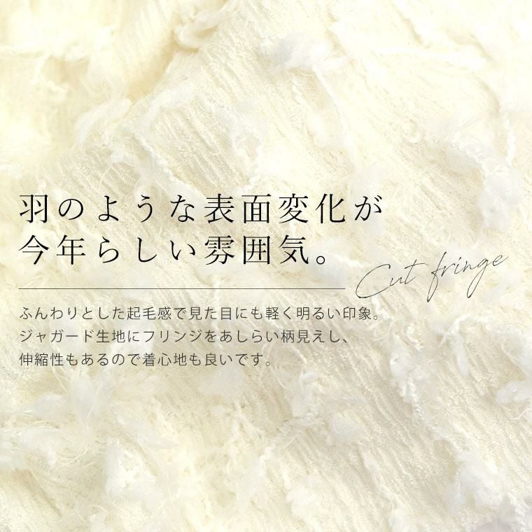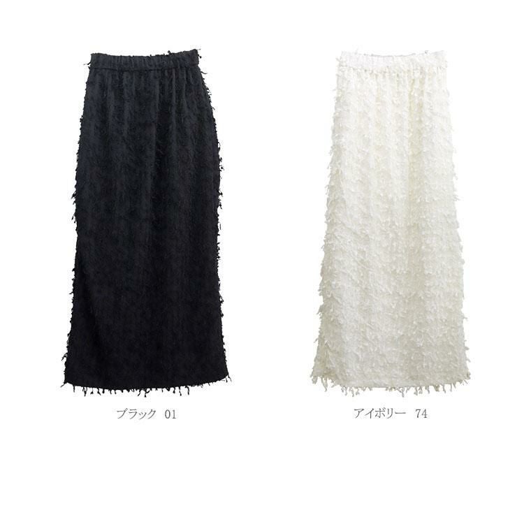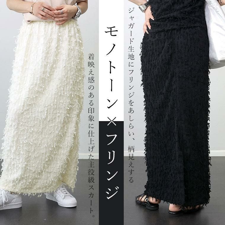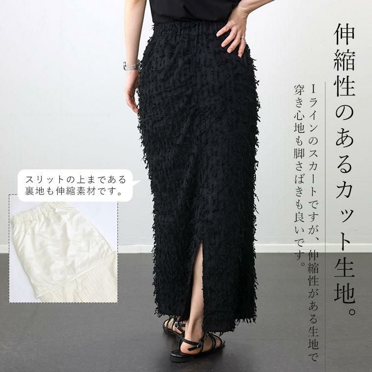表面変化のある素材が着こなしを華やげるIラインスカートです。ジャガード生地にフリンジをあしらい、柄見えする着映え感の印象に仕上げた主役級スカート。ベースカラーがモノトーンなので着こなしに取り入れやすいのも魅力。伸縮性のあるカット生地で、スリットの上まである裏地も伸縮します。深めのスリットで脚さばきも楽々。スリットはお好みで前にも後ろにも着用できます。ウエストは全周広ゴムです。