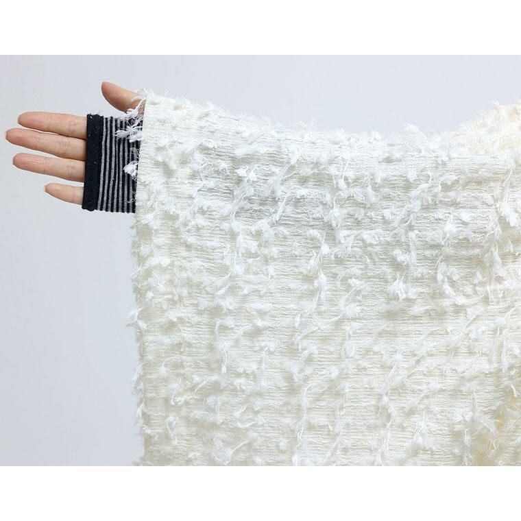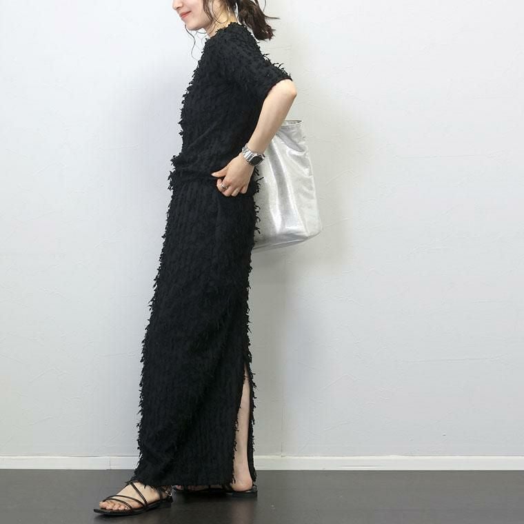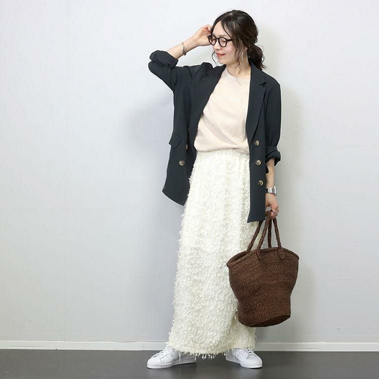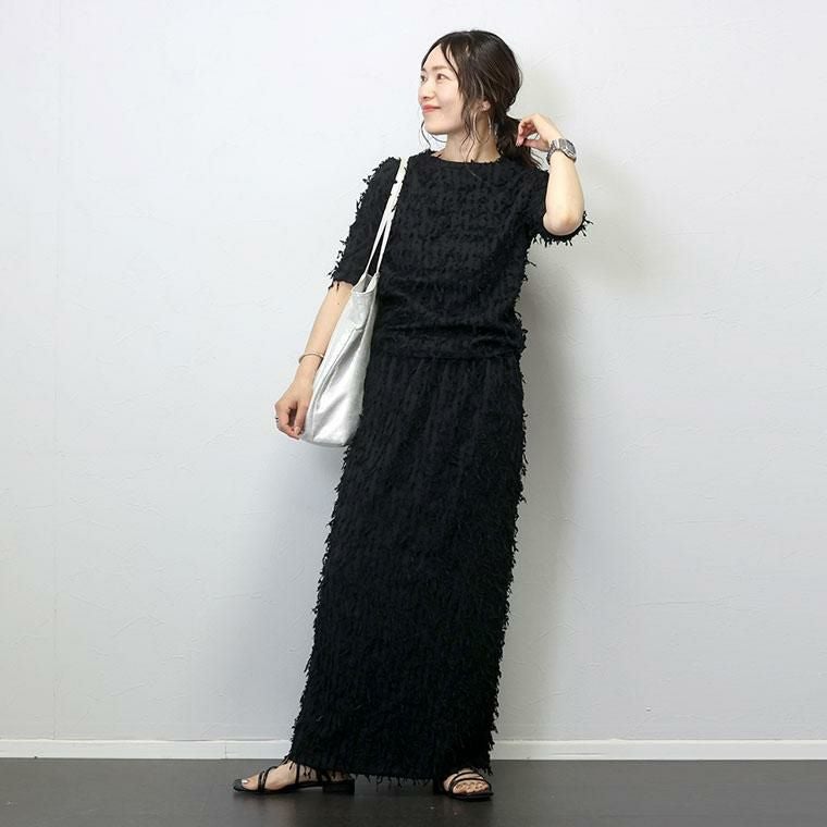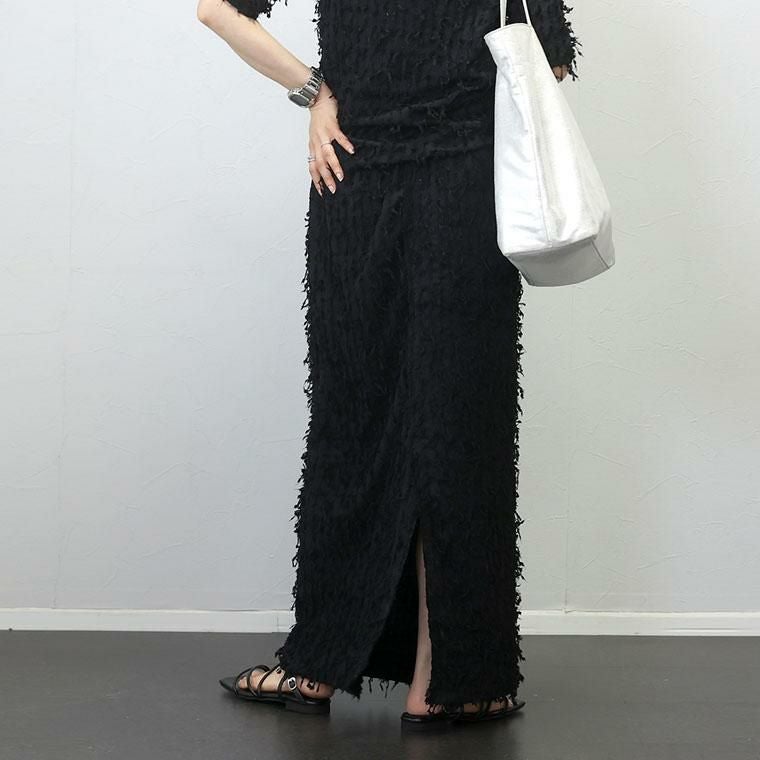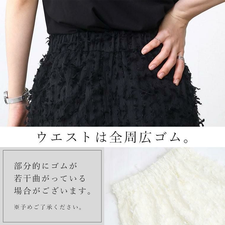 表面変化のある素材が着こなしを華やげるIラインスカートです。ジャガード生地にフリンジをあしらい、柄見えする着映え感の印象に仕上げた主役級スカート。ベースカラーがモノトーンなので着こなしに取り入れやすいのも魅力。伸縮性のあるカット生地で、スリットの上まである裏地も伸縮します。深めのスリットで脚さばきも楽々。スリットはお好みで前にも後ろにも着用できます。ウエストは全周広ゴムです。