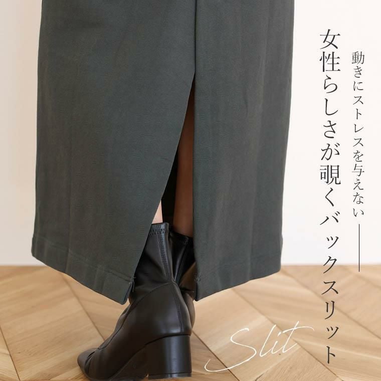 着丈はくるぶしの上くらい。ウエストはピタッとしていますがキツい感じはありません。腰まわりはピタっとしているのでラインがでます。スリットは深く、膝の上くらいの位置から入っています。