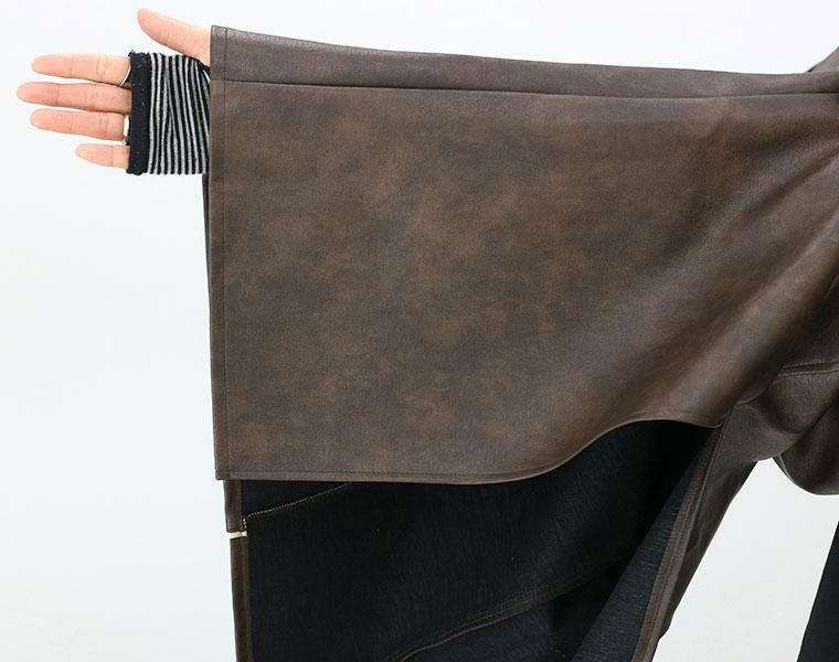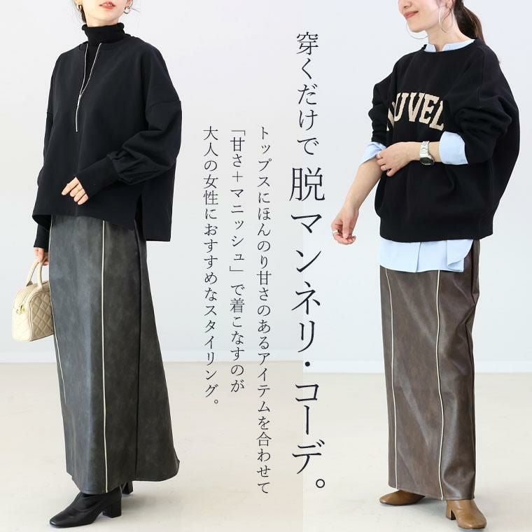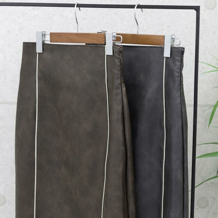 トレンドのフェイクレザーにパイピングをあしらったストレートスカート。フロント2箇所には配色パイピングをデザインしアクセントとして洒落見え。ビンテージ感あるフェイクレザーとのかけ合わせが新鮮で脱マンネリスタイルをつくります。ウエストは切替のないハイウエストとなっており、脚長効果抜群。後ろには幅広なシャーリングをあしらいゴシックエッセンスをプラスしました。自宅で手洗い可能、春先までしっかり活躍するアイテムです。