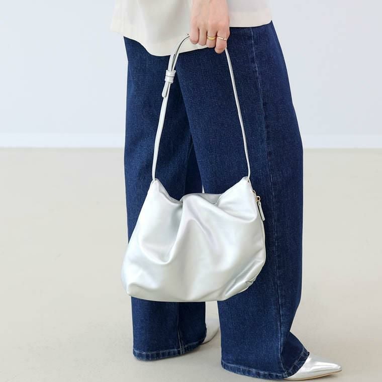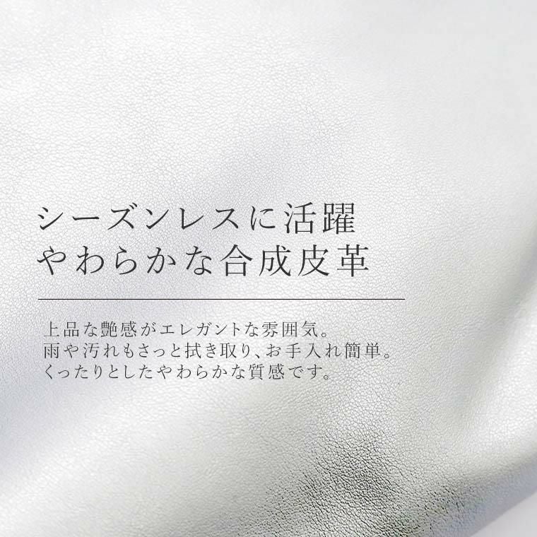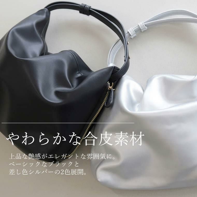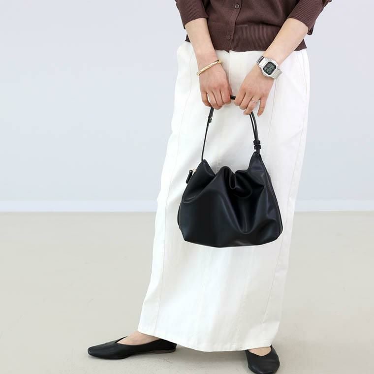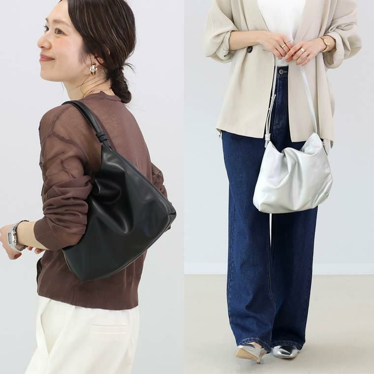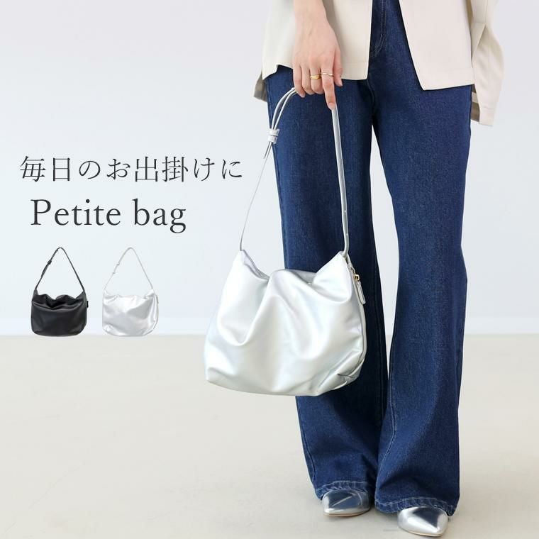 毎日のお出掛けに便利な小ぶりサイズのペティートバッグ。必要なものをコンパクトに収納できるサイズ感で使いやすく、実用性とデザイン性を両立。素材はやわらかな合成皮革。上品な艶感がエレガントな雰囲気で、お手入れが楽なのも嬉しいポイントです。ストラップがバッグ上部に通されたデザインで、くしゅっとフォルムを変えられるのが特徴。ストラップの長さも調節でき、ハンドバッグにもショルダーバッグにもなる2way仕様です。シーンに合わせて使い分けられます。開閉部はサイドに設置し、肩にかけたまま中身の出し入れが可能。大人の為の洗練バッグです。