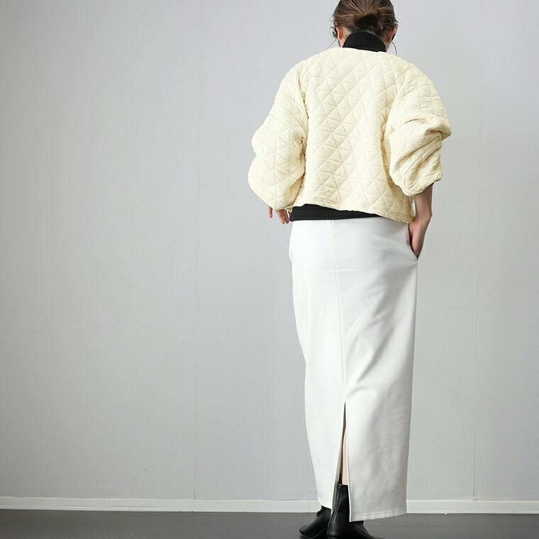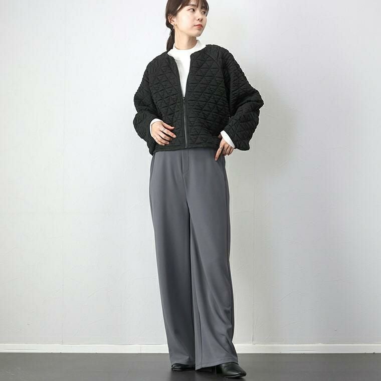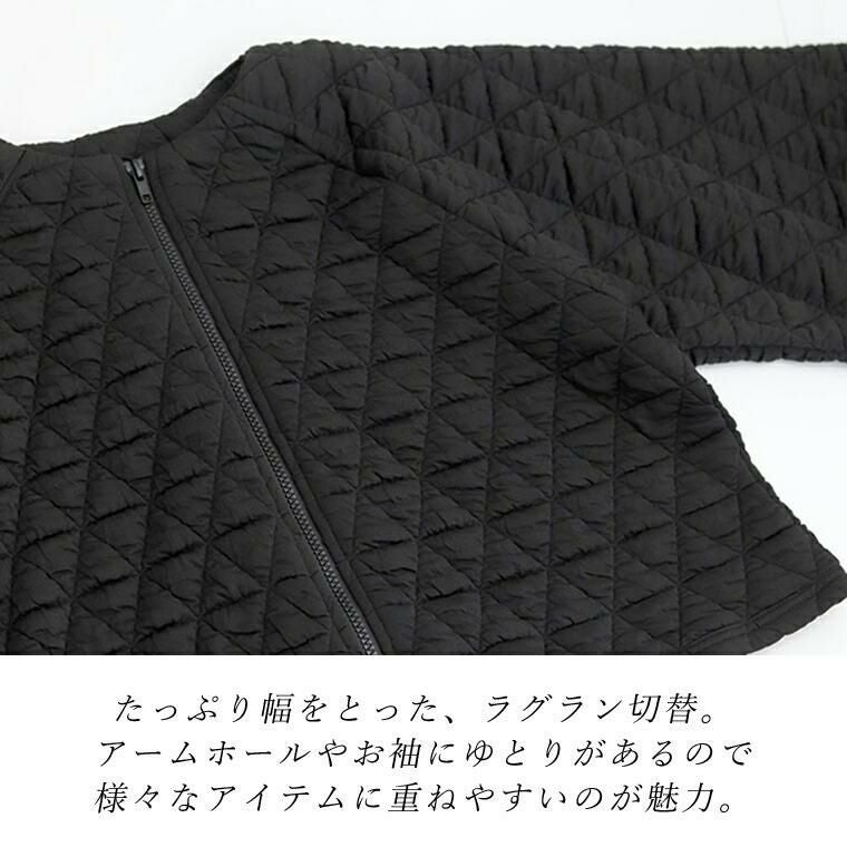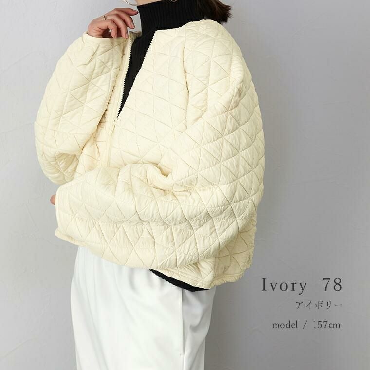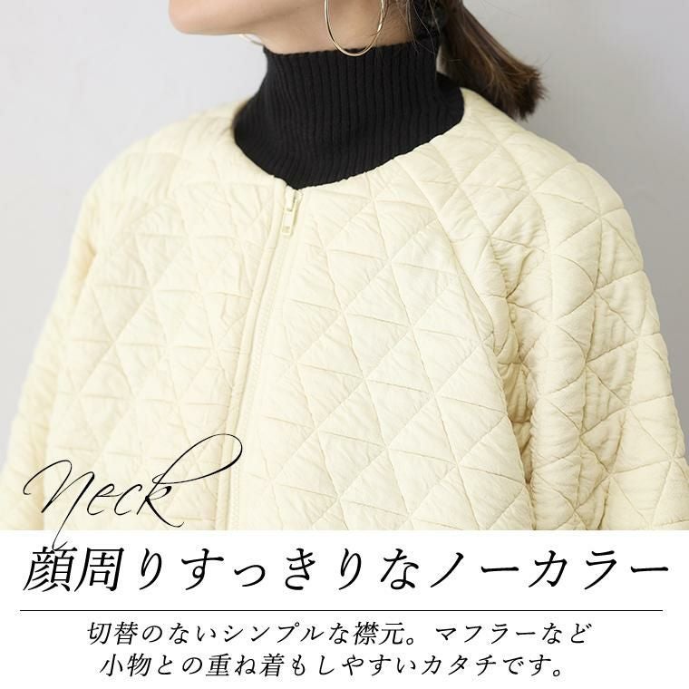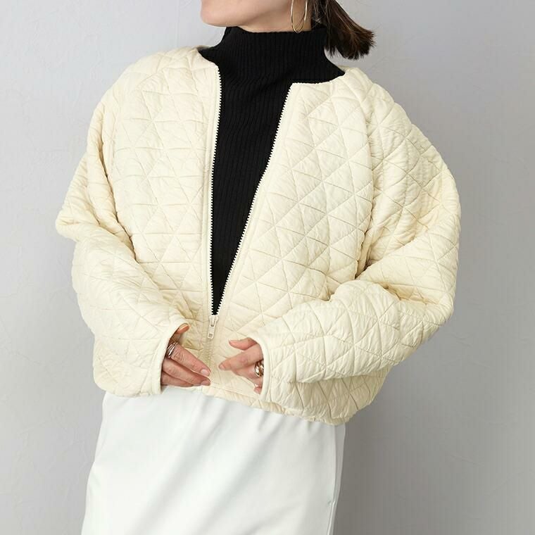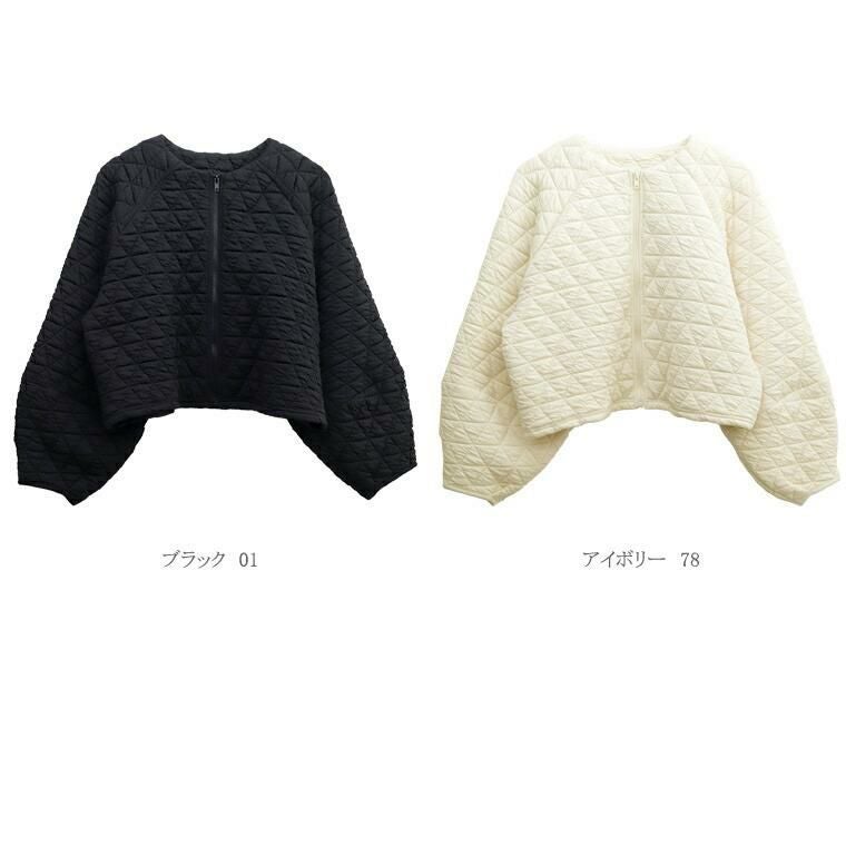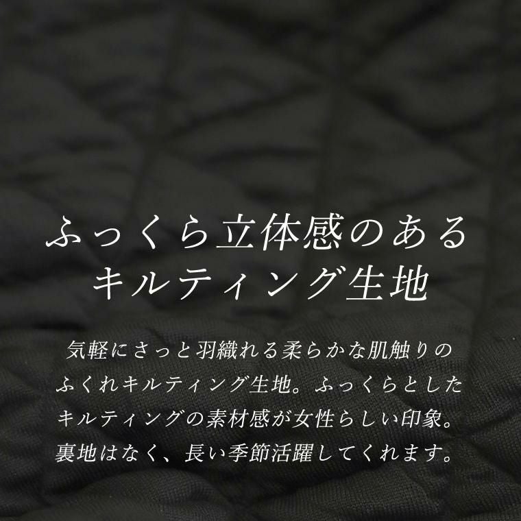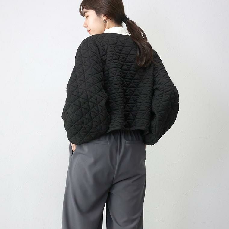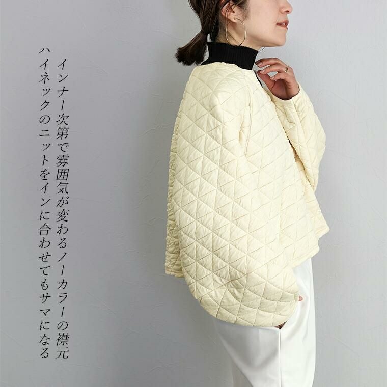 キルティングノーカラーブルゾン 立体感のあるふくれキルティング素材で仕立てたブルゾン。 裏地のない、柔らかく軽い着心地で毎日に気軽に羽織れる一枚。 羽織としてはもちろん、前のファスナーを閉じればプルオーバーと しても着用できるもたつきのない丈感に仕上げ、季節の変わり目 にもしっかり重宝します。すっきり見せのノーカラーとぽってりと したお袖のラインがフェミニンで女性らしさを演出。 スタイルアップ効果を狙えるシルエット&トレンド感を誘う デザインでさっと羽織るだけでコーデが決まる。 大人コーデの主役におすすめのアウターです。
