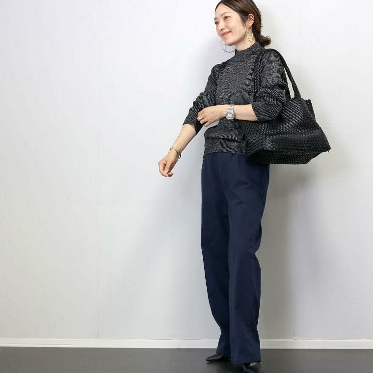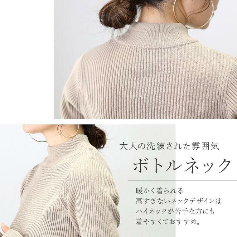 トレンド不問で着まわせるハイゲージニット。キラリと光るラメが華やかな印象。一枚ではもちろん、シャツやワンピース、サロペット、ベストなどの重ね着にも重宝するボトルネックデザイン。薄手でもたつきがなく、使い勝手が良いのが魅力です。縦ラインを強調するリブ編みで伸縮性も抜群。すっきりとした見た目に仕上げてくれるのも嬉しい。着丈は腰まわりをしっかりカバーするやや長め設定。ボトムへのインもすっきりきまります。一枚あると便利なアイテムです。